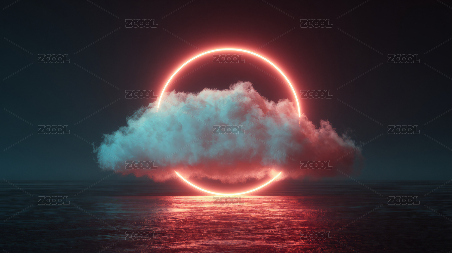 霓虹圆环环绕的蓬松云朵