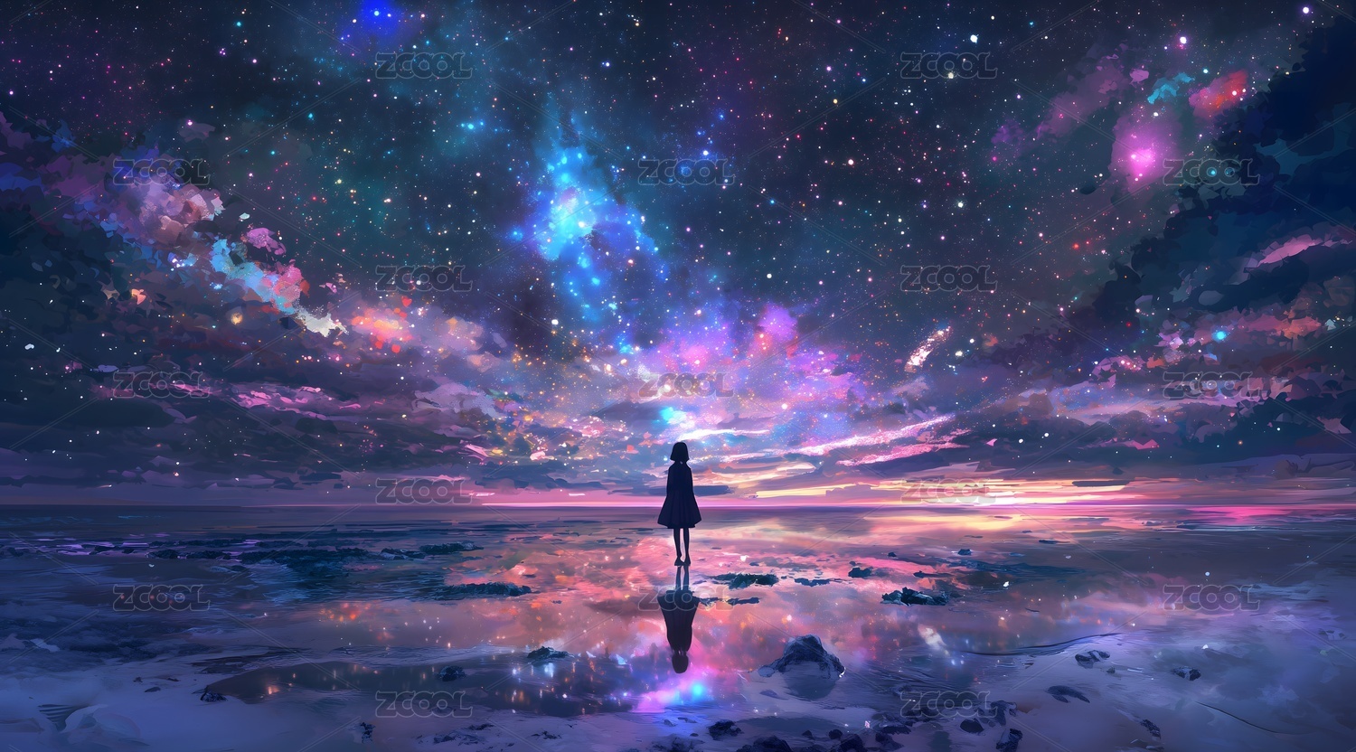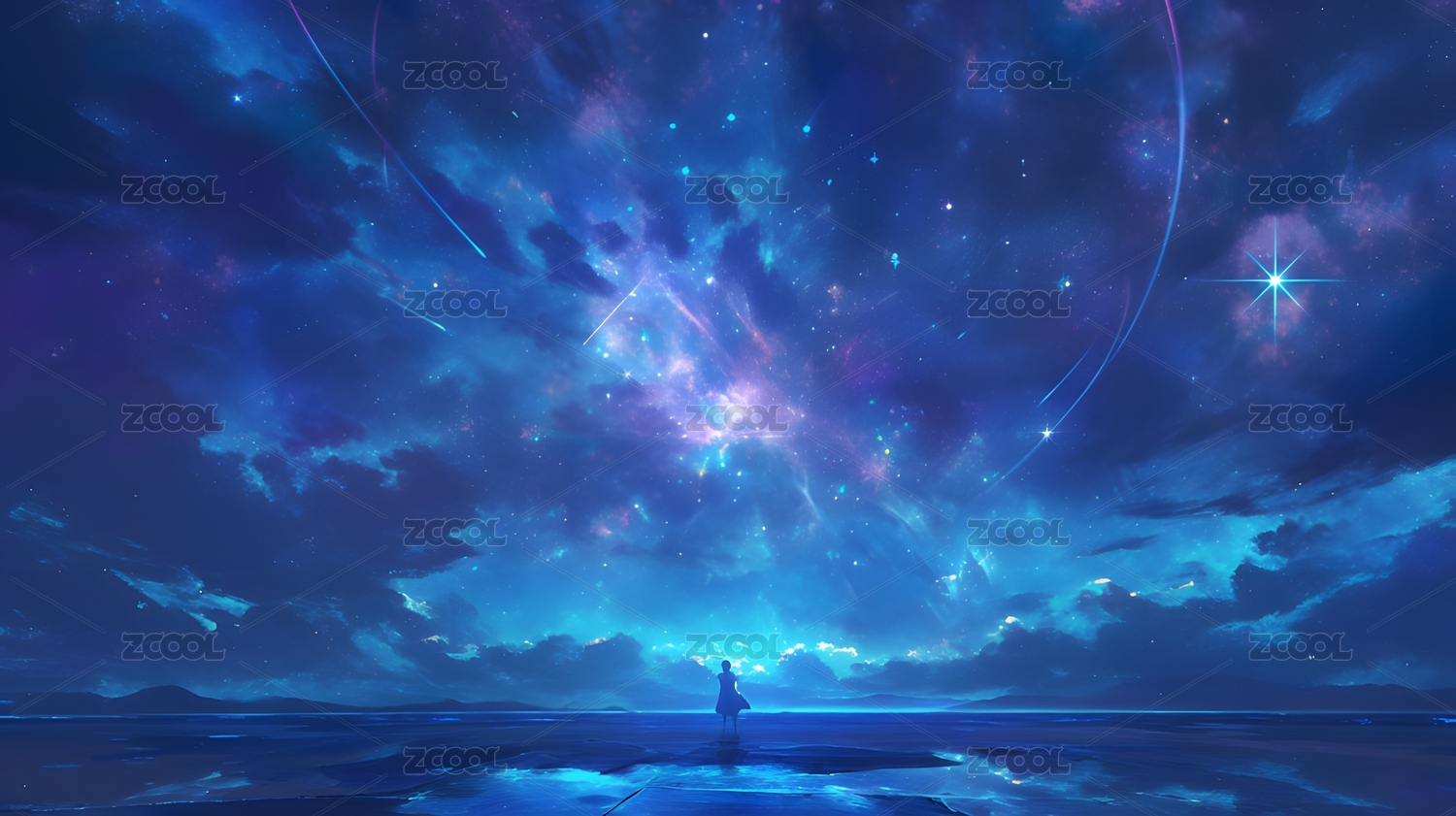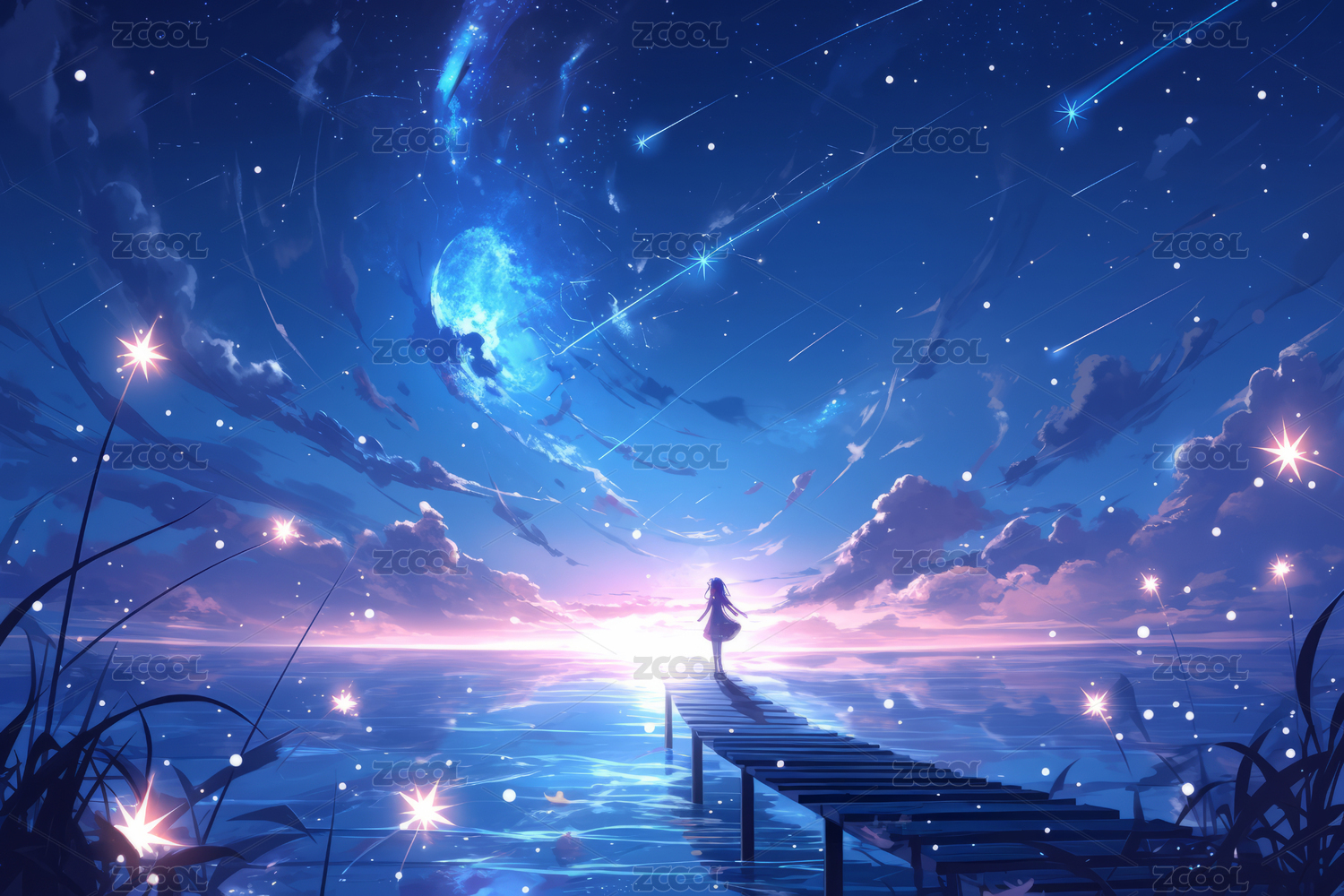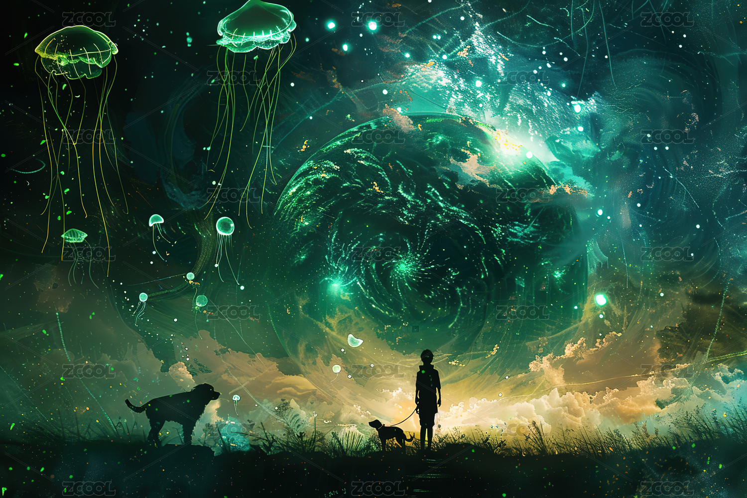 蓝色色调女孩站在阶梯上看水母梦幻场景