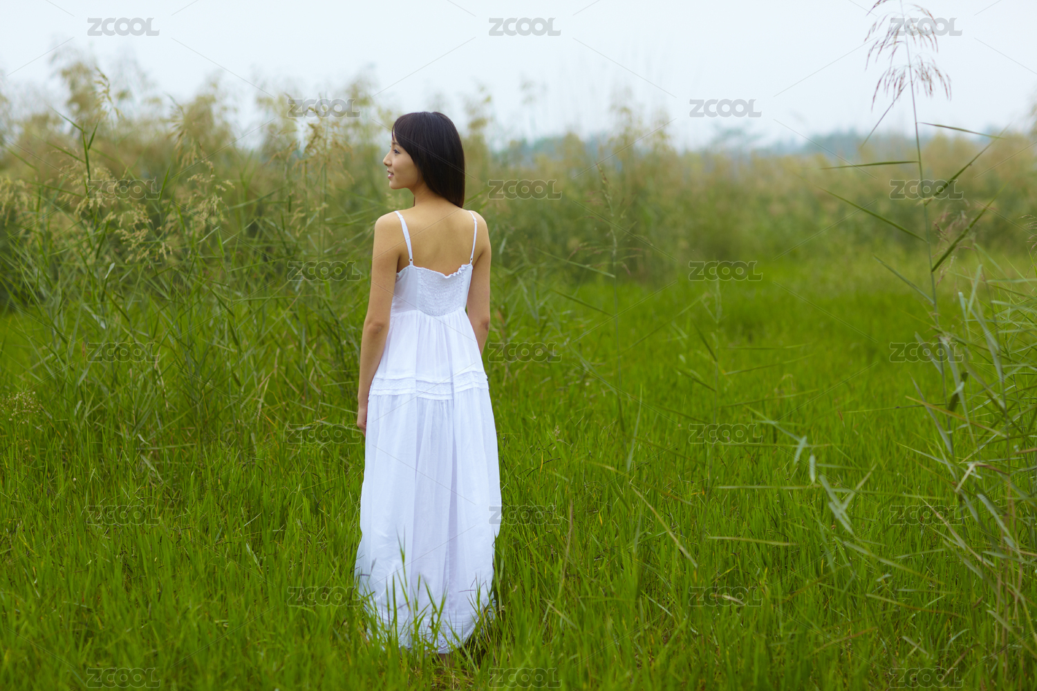 年轻漂亮的亚洲女人户外与白色礼服草甸