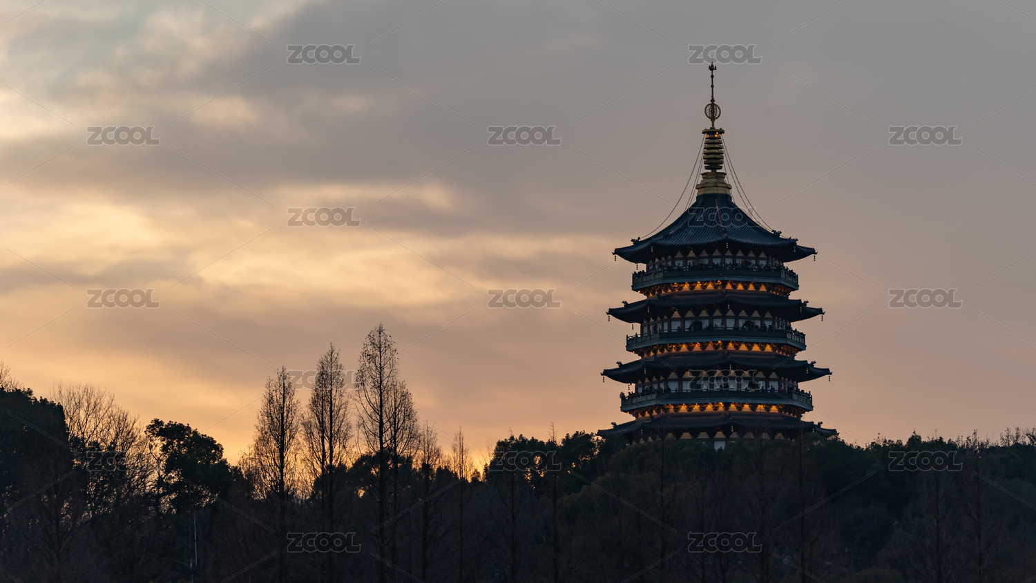杭州西湖雷峰塔黄昏晚霞