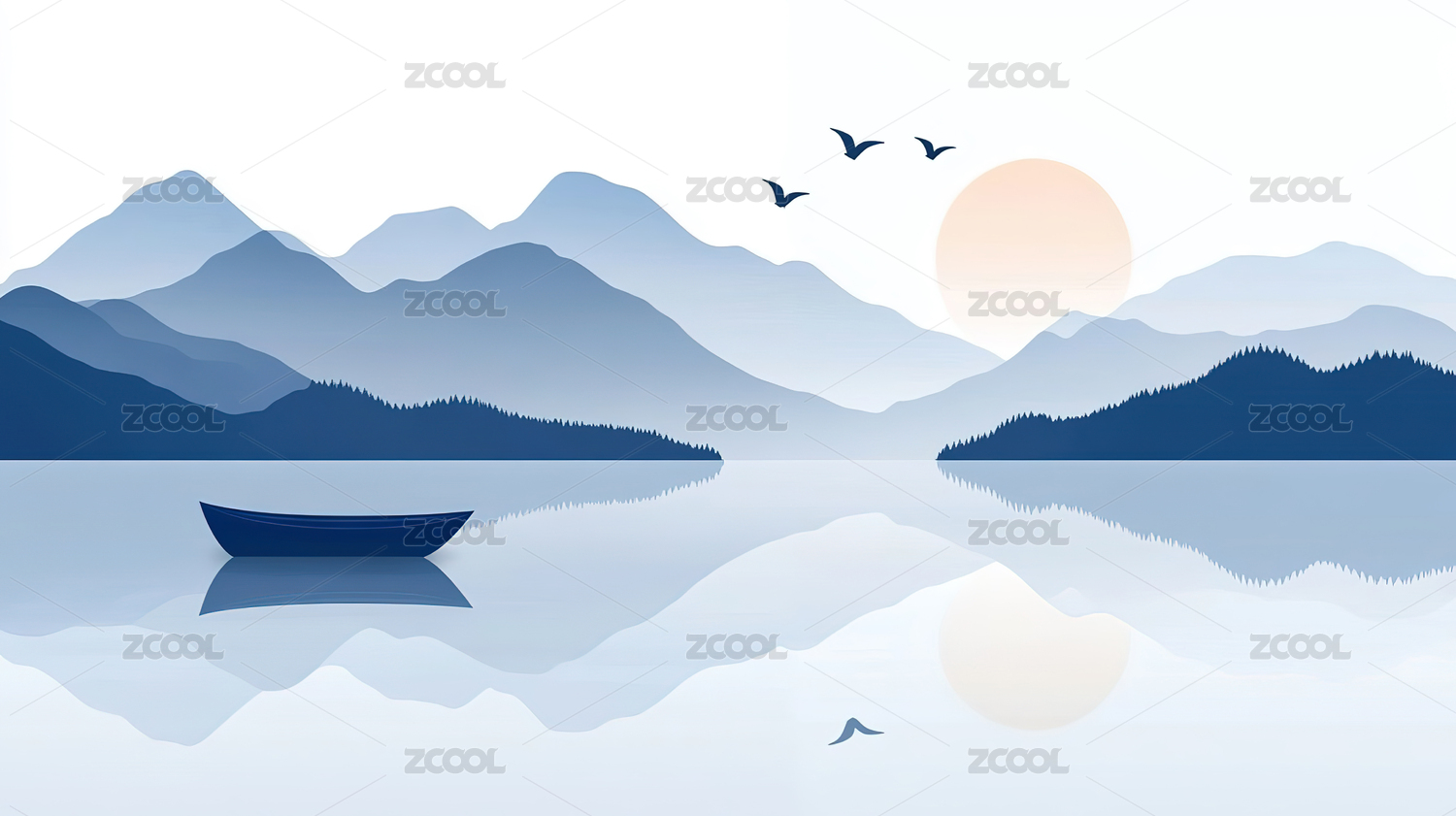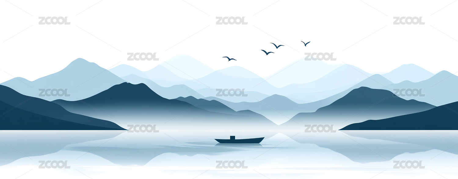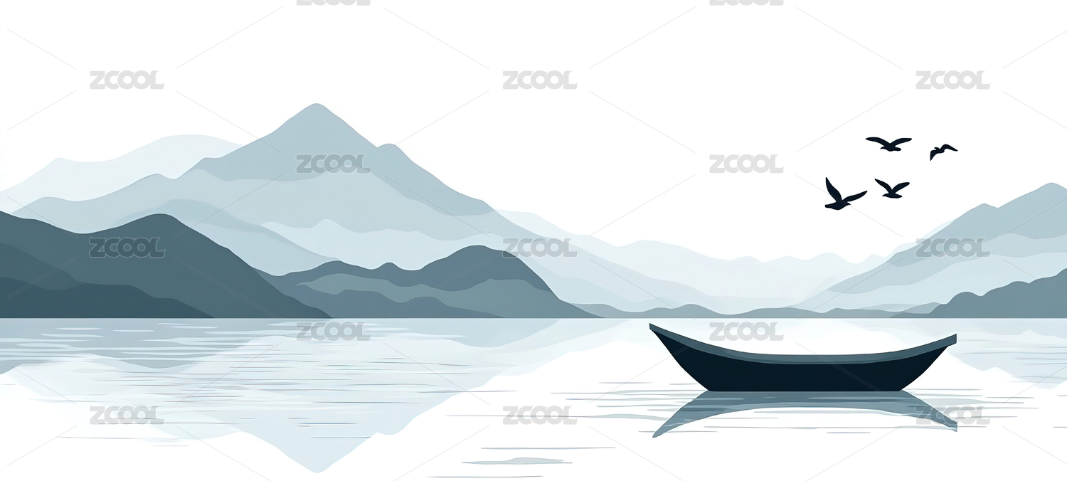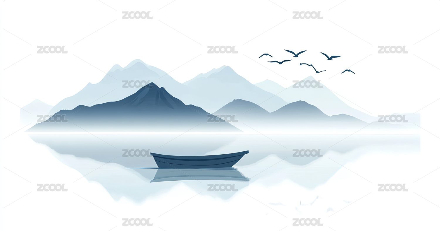 水墨山水意境,扁舟独钓,飞鸟鸣涧