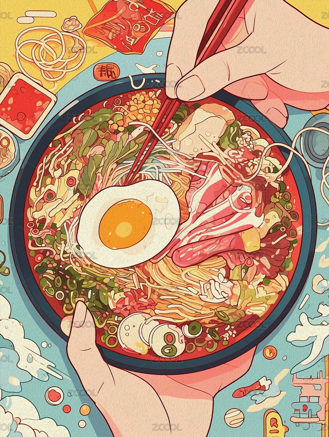 插画风格的一碗美味拉面