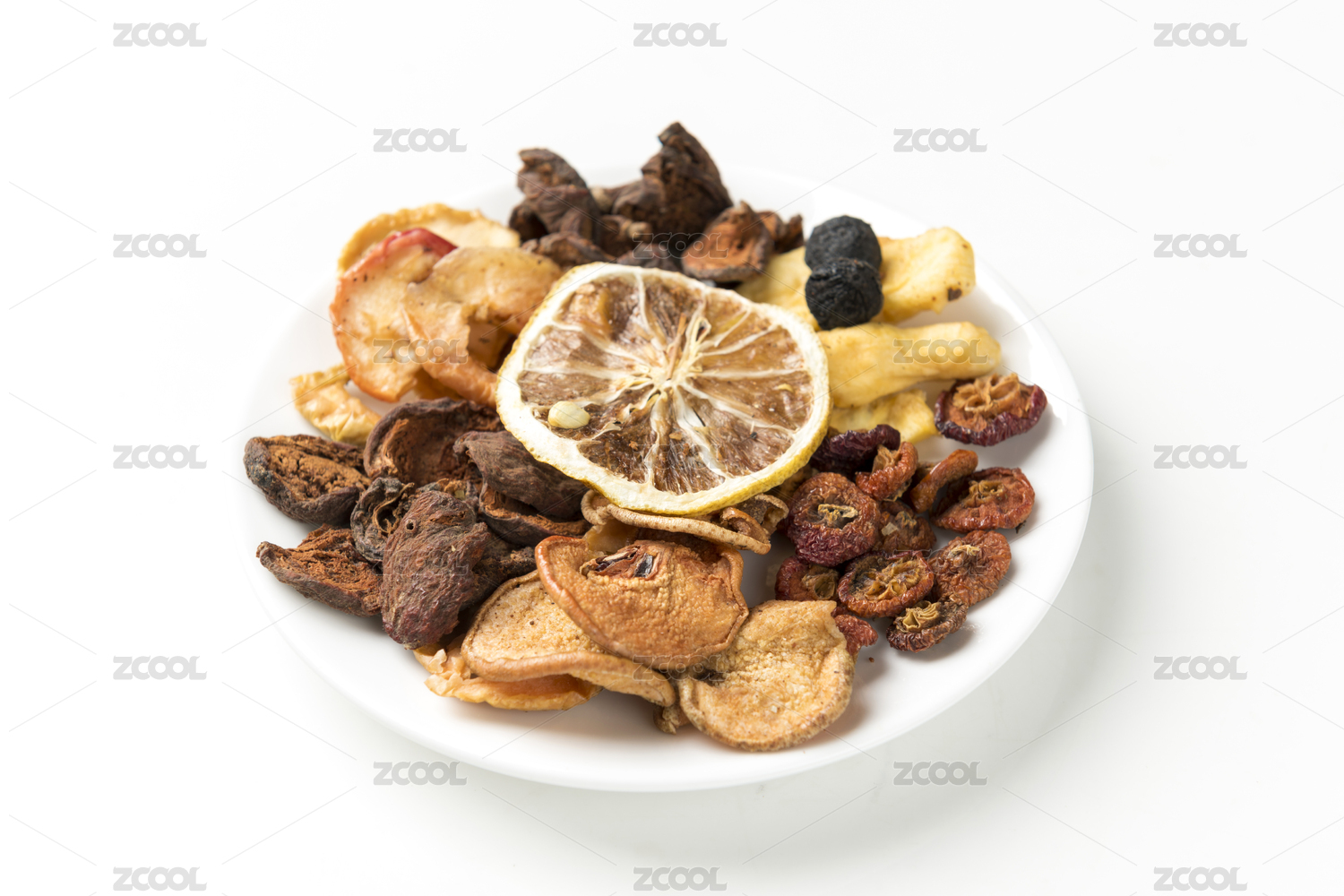 白色盘子里的核桃仁和散乱在盘子外面的核桃壳