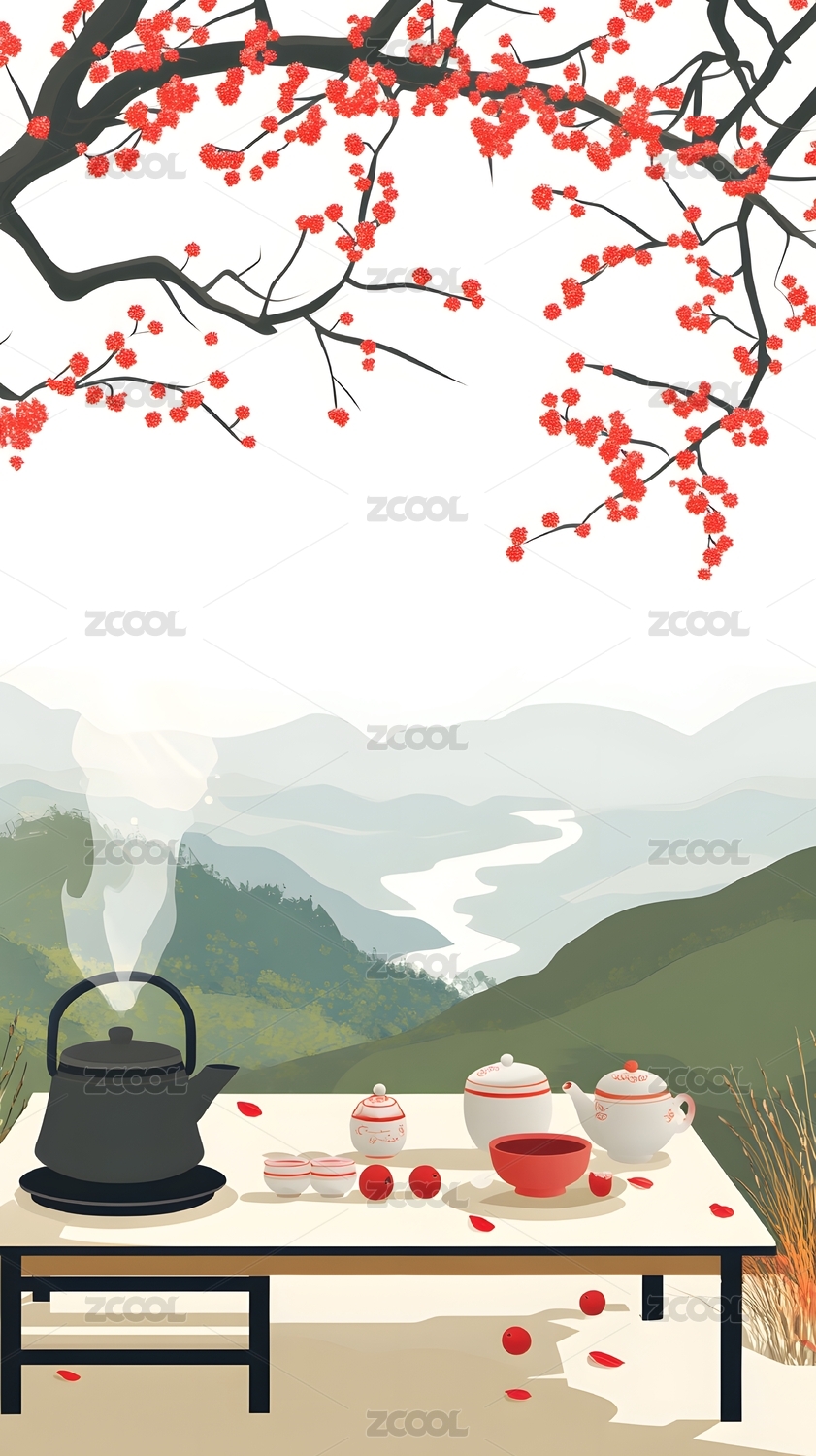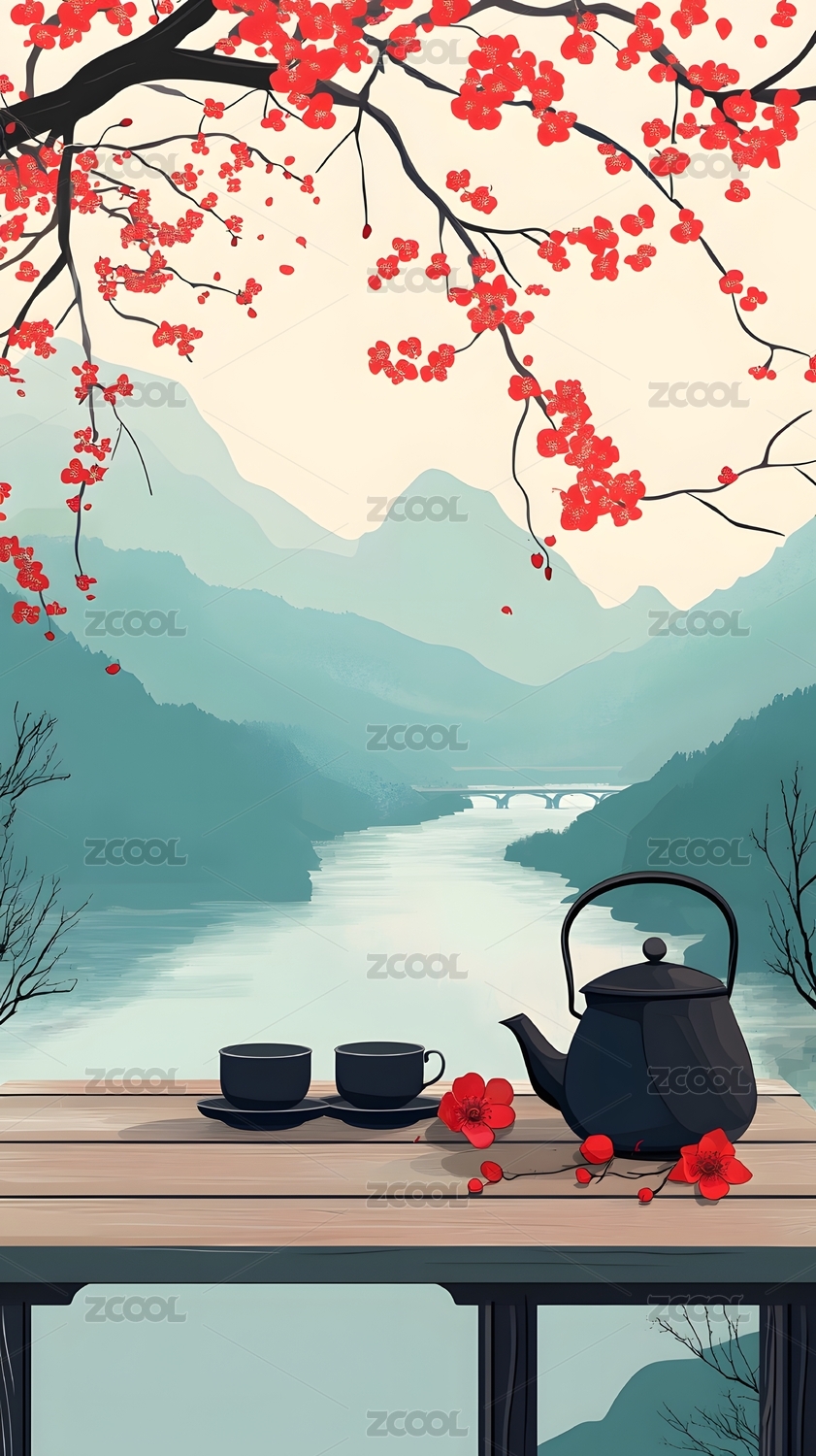 插画,艺术,设计,创意,花,传统,茶壶,火焰,木板,山