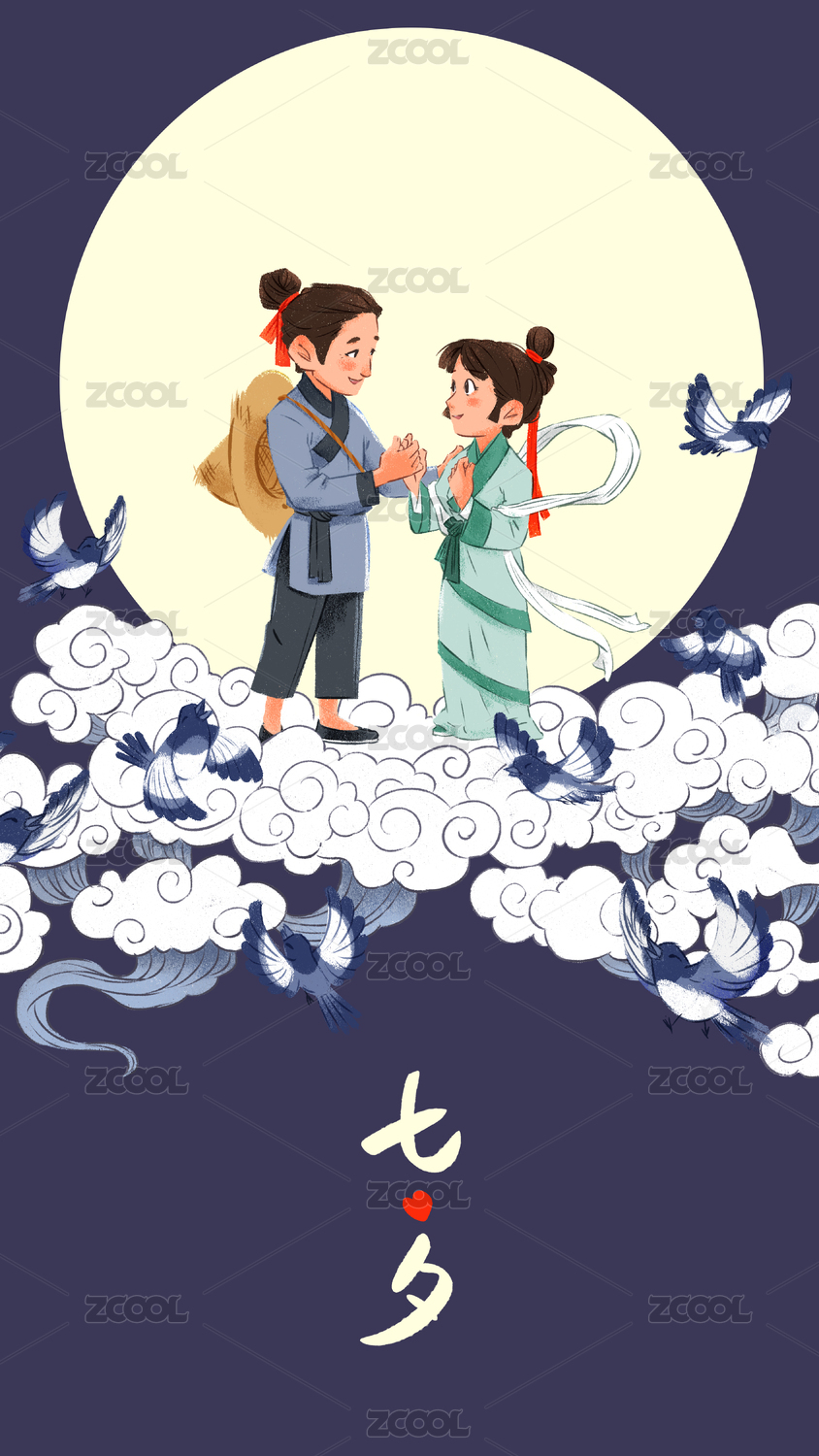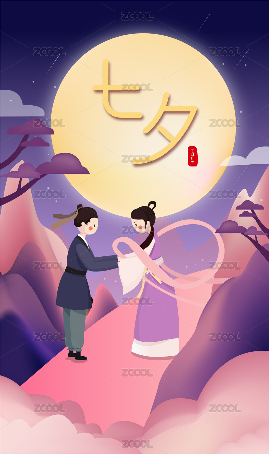 七夕牛郎织女月下鹊桥浪漫相会插画海报