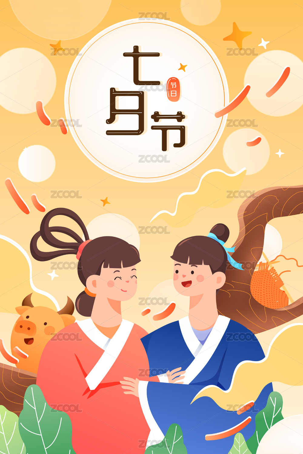 情人节牛郎织女奏乐相约七夕手绘竖版海报