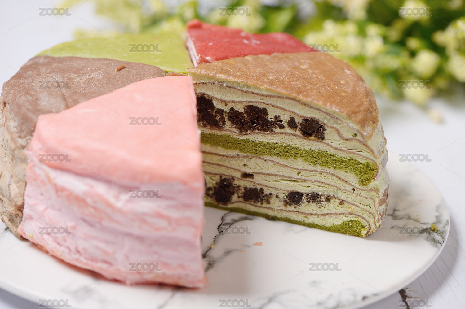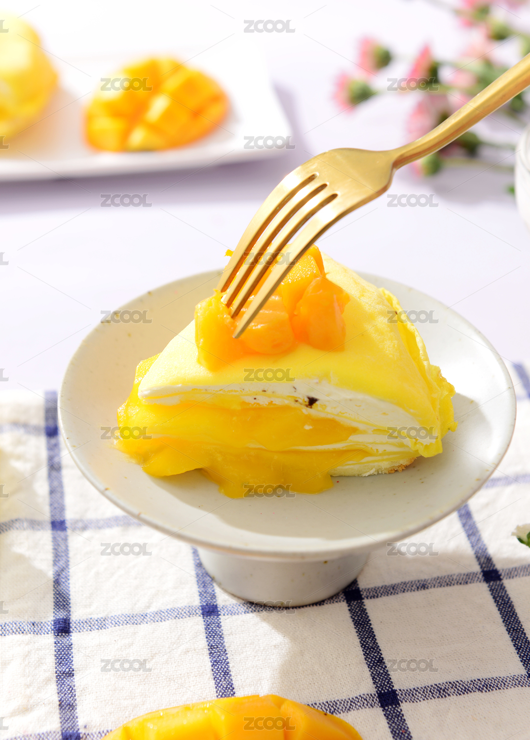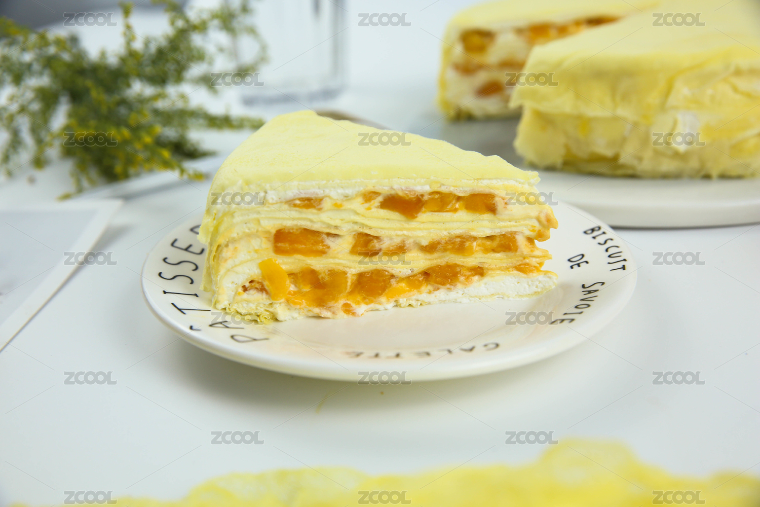 一盘榴莲蛋糕西点摆放在桌面上特写