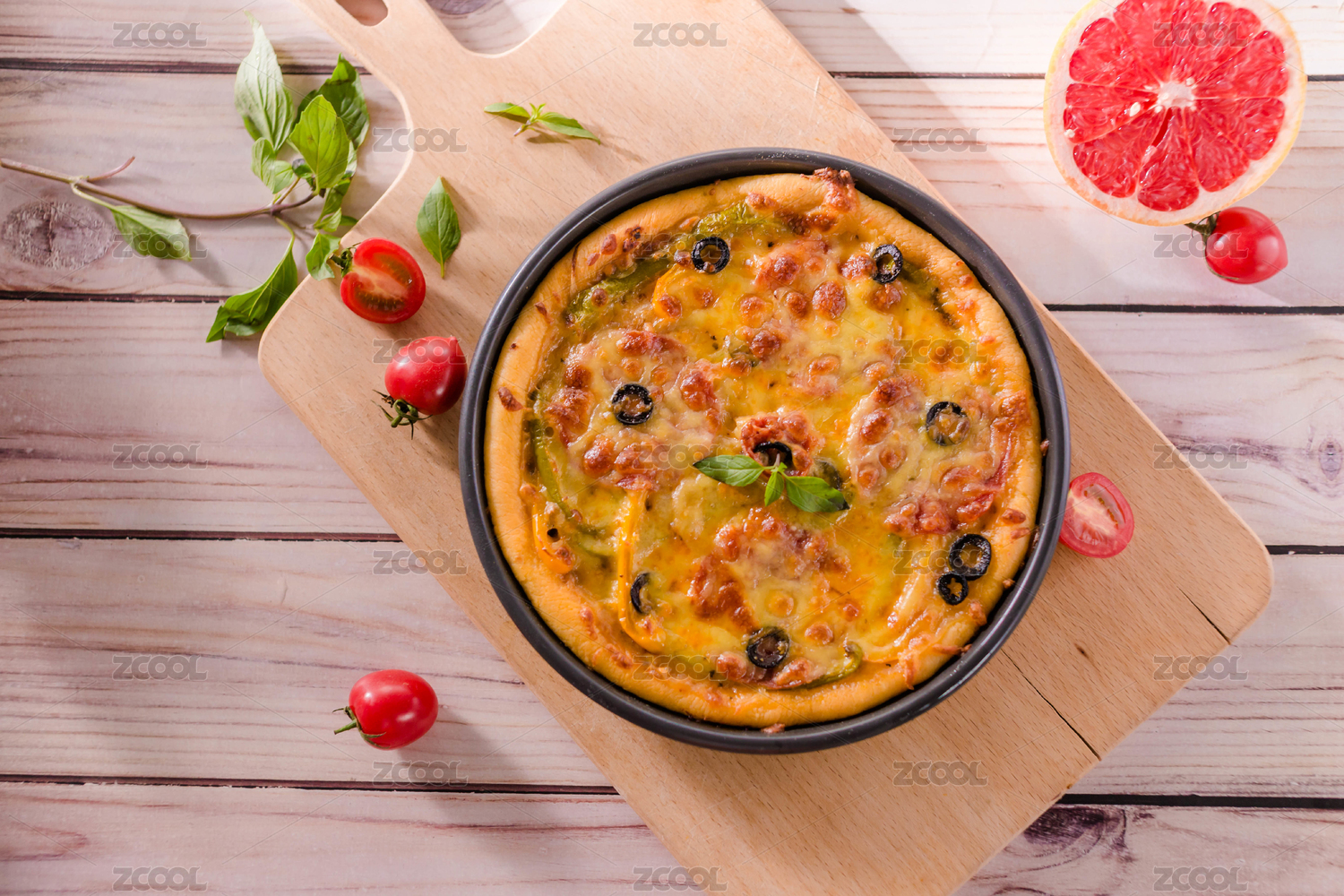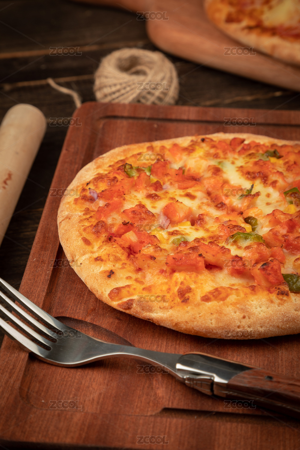 披萨,火腿片,培根切片,烤熟的,焦黄色,面包,蛋糕,暗色木纹底,暗调,白色桌面