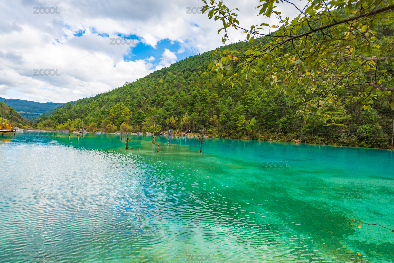 中国云南省丽江市,清澈的碧绿色湖泊与山林