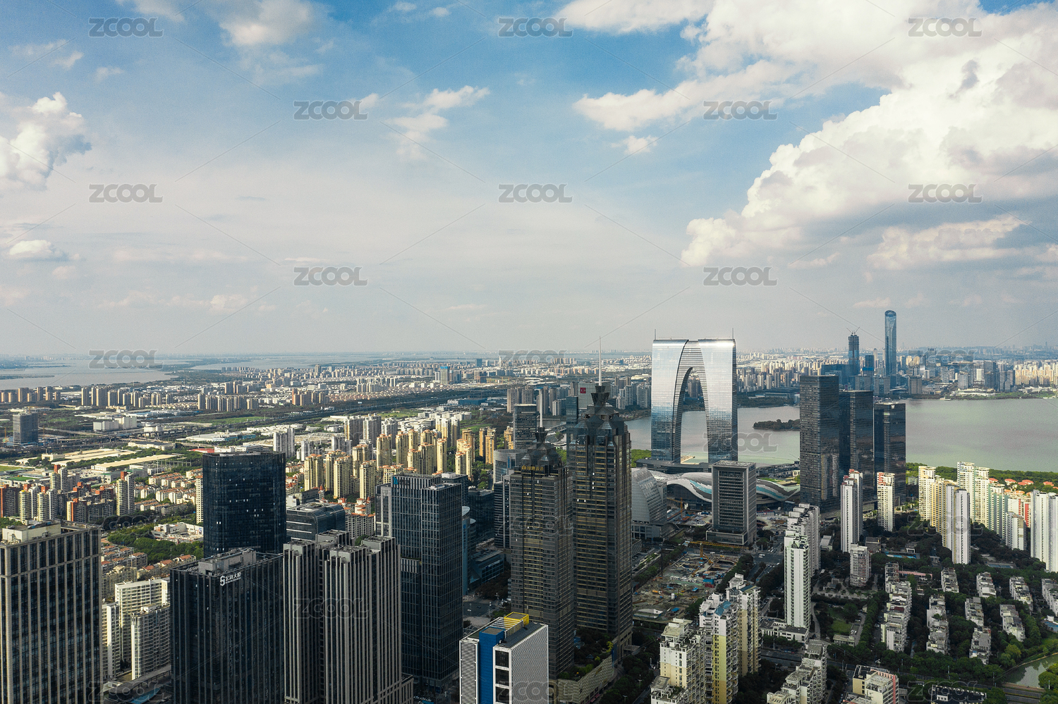 苏州,东方之门,晴朗,蓝天白云,户外,上空,城市地标,住宅群,小区,航拍