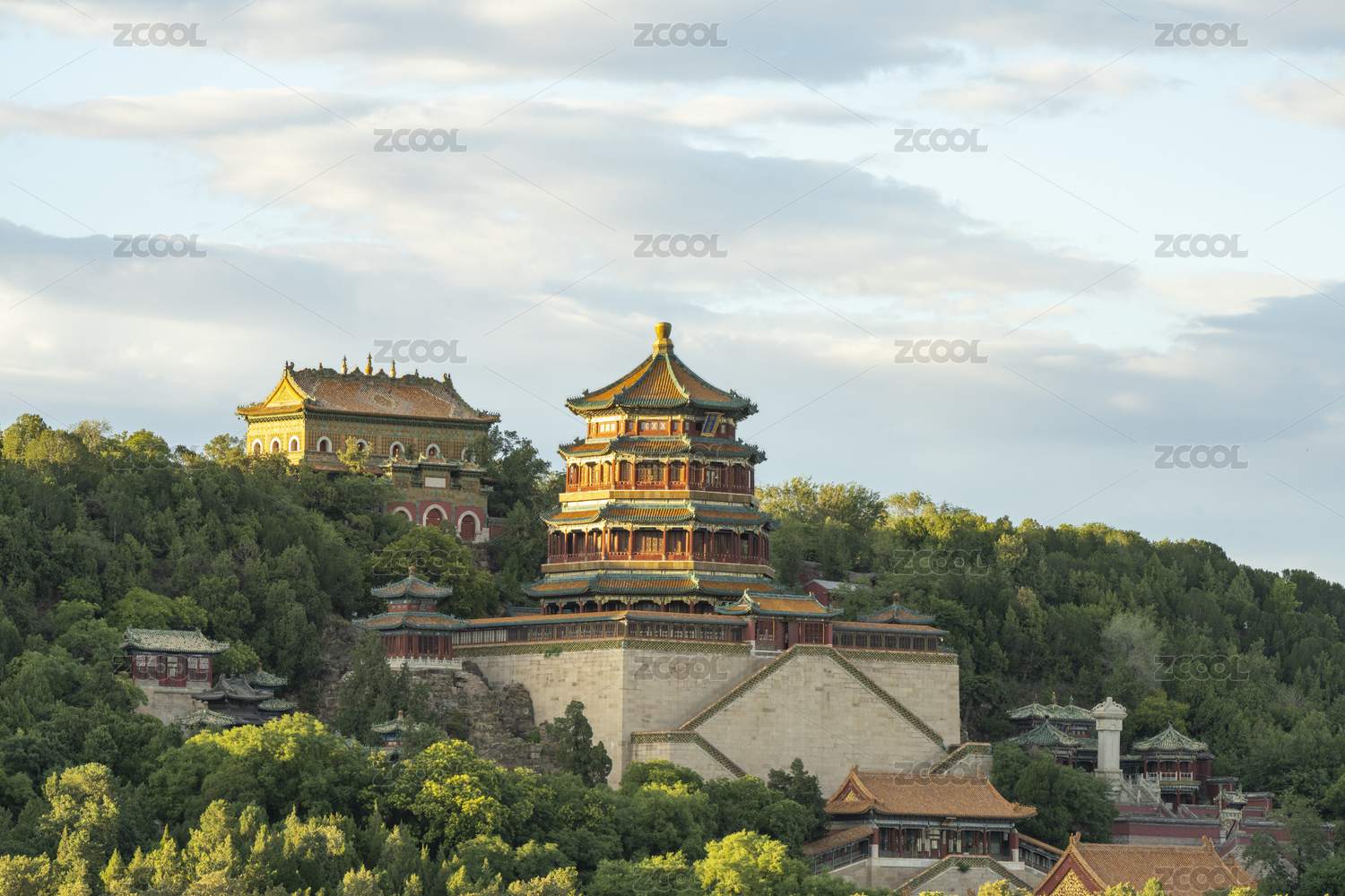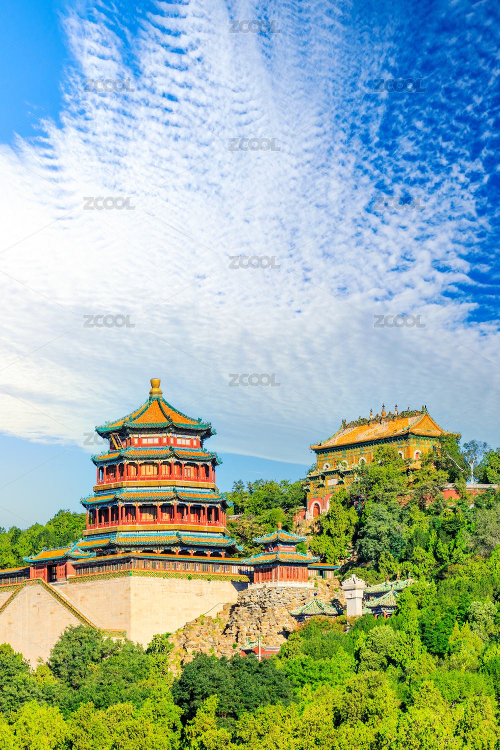 中国北京颐和园中万寿山顶的佛香阁和智慧海