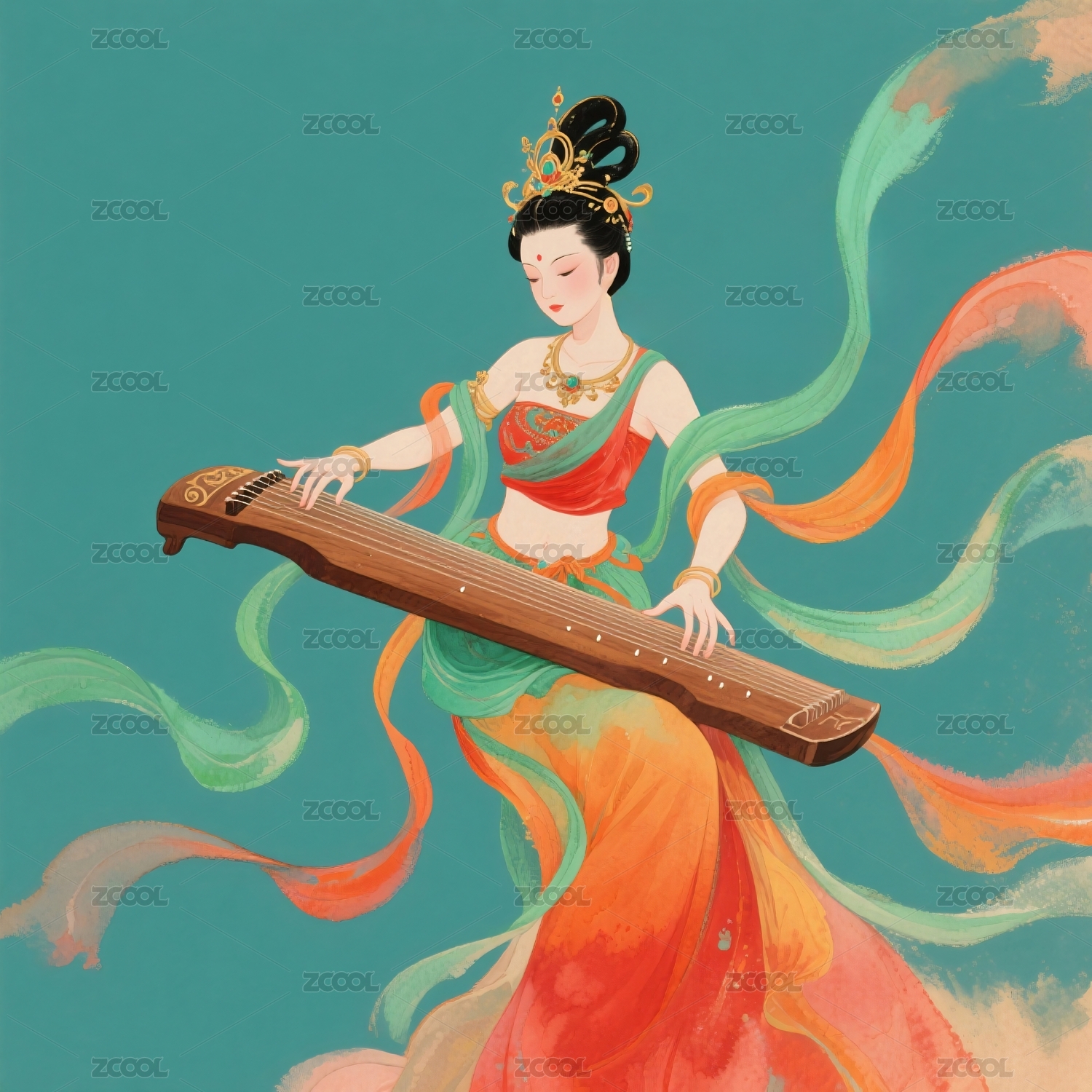 古装女子演奏古琴乐器