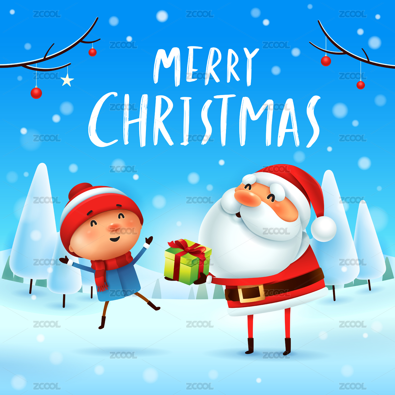 圣诞老人给在场的圣诞雪景一个孩子。冬季景观。