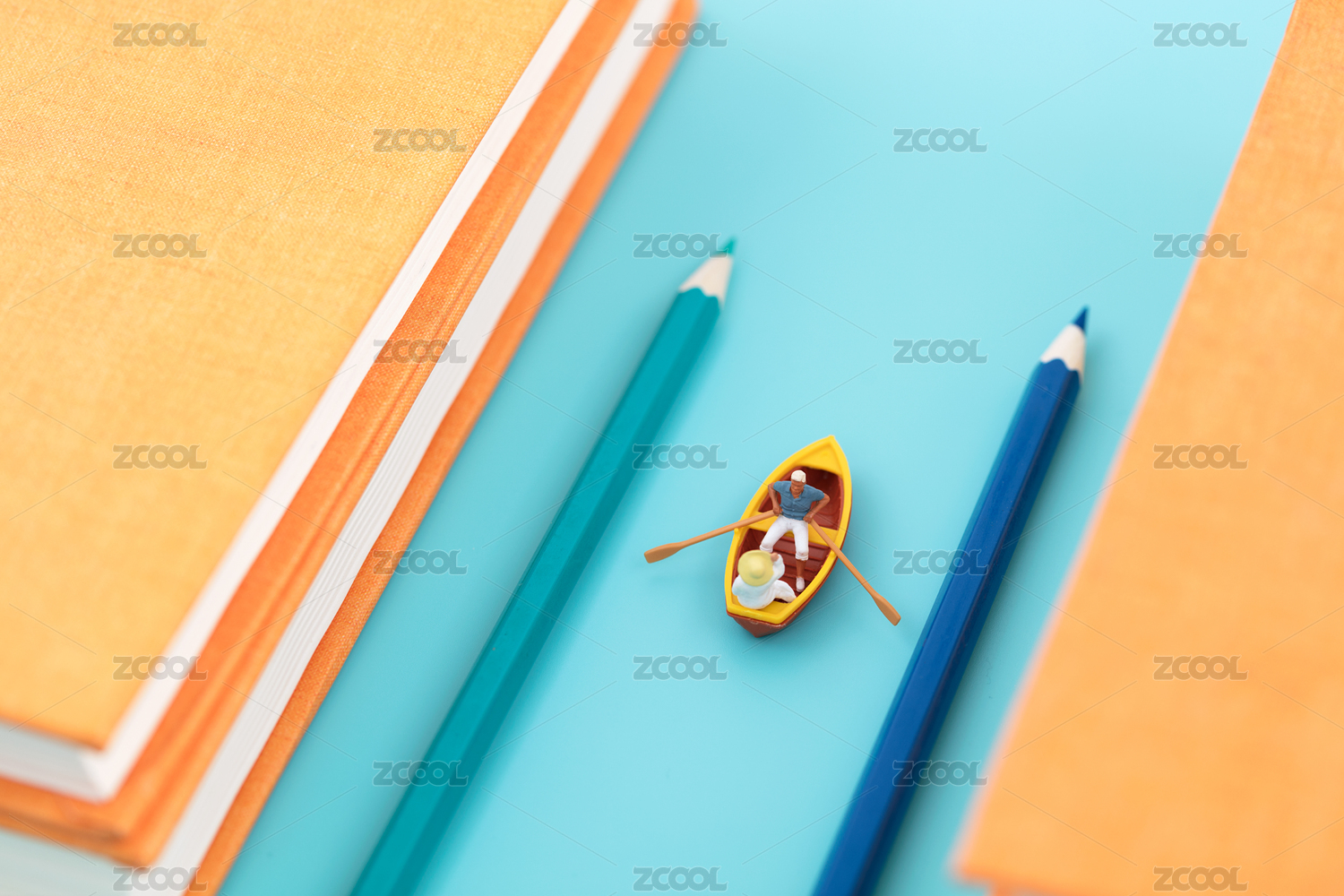 骑车的微缩模型通过彩铅笔到达书本顶端