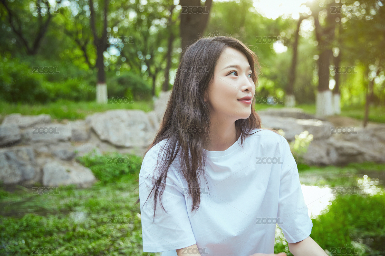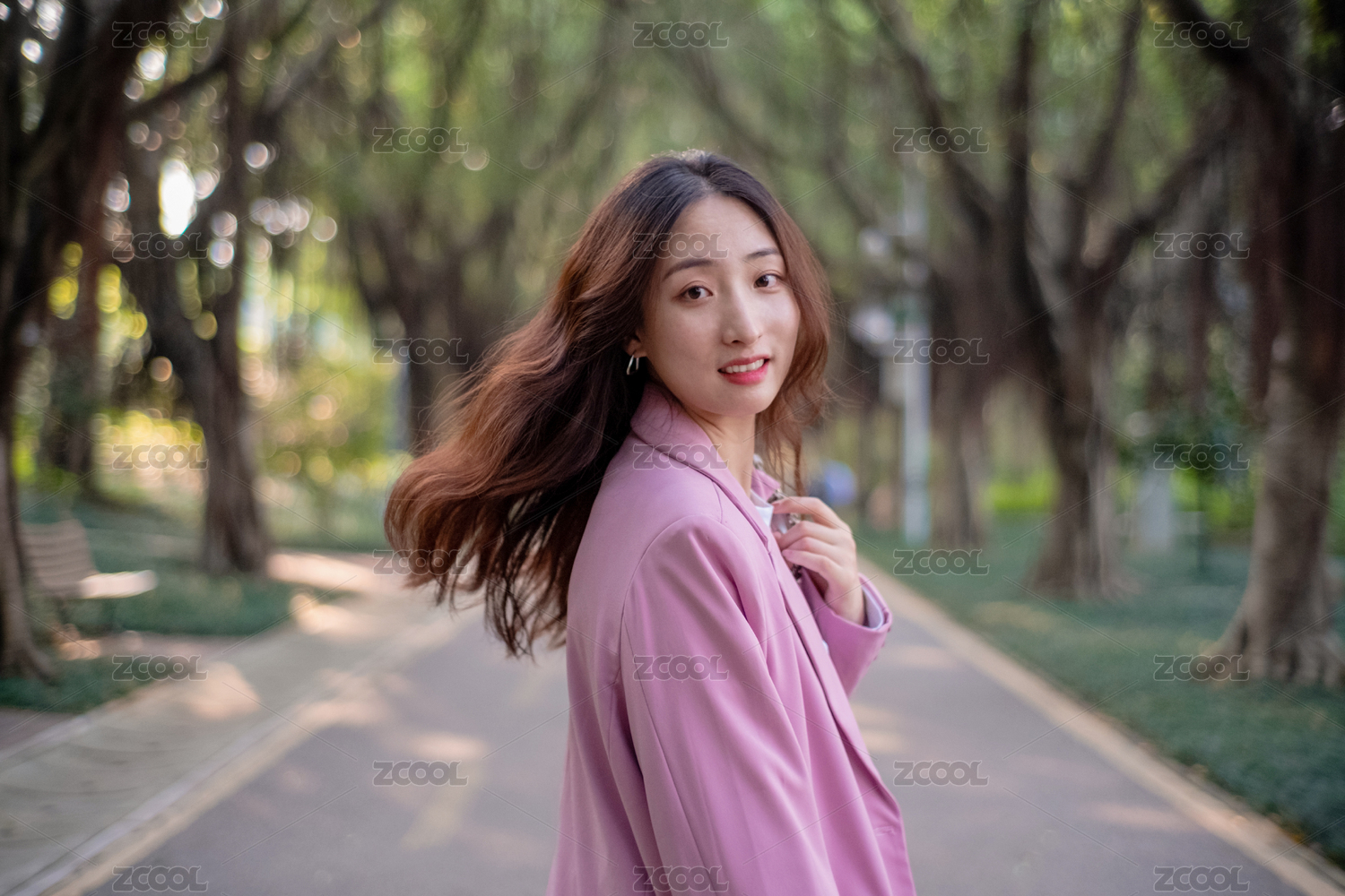 户外公园夕阳下逆光拍摄的亚洲美少女