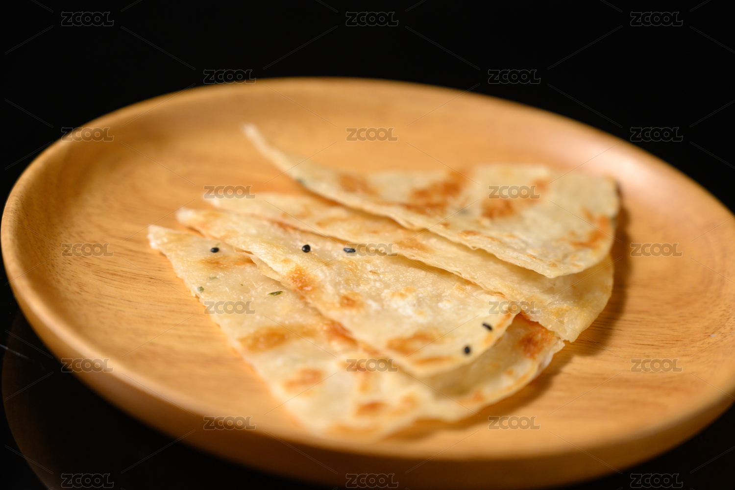 暗色木纹桌上放着一盘羊肉大葱的馅饼