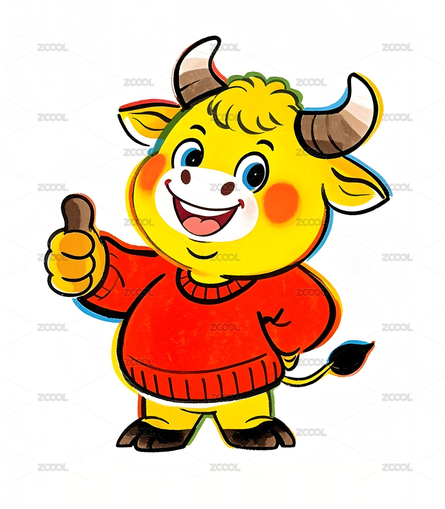卡通动物牛手拿滑板竖大拇指微笑红球鞋
