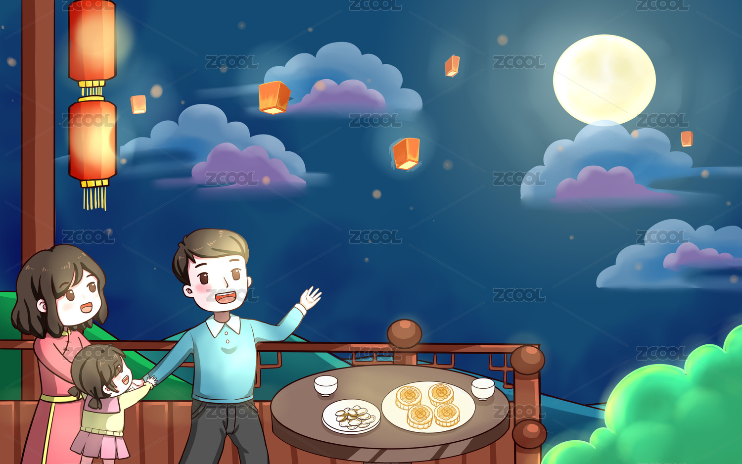 中秋,月饼,月亮,家人,赏月,玉兔,中秋插画,女孩,灯笼