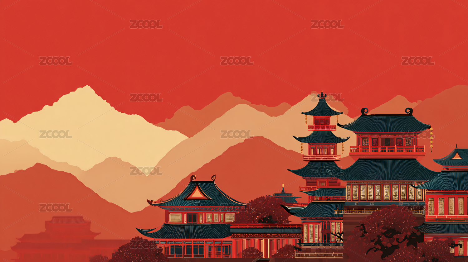 古风建筑山水插画