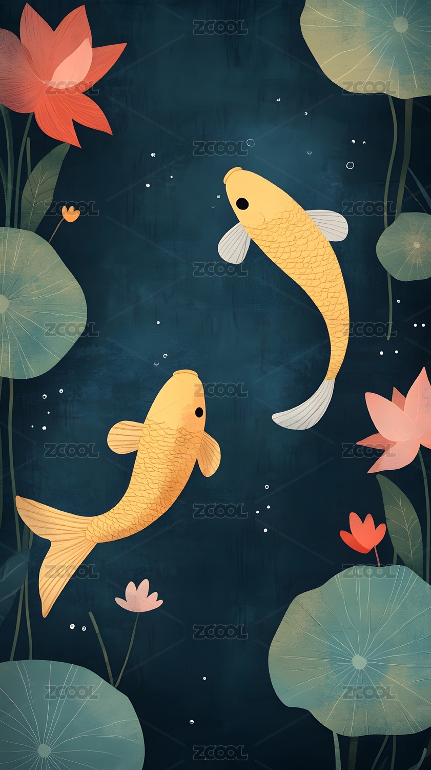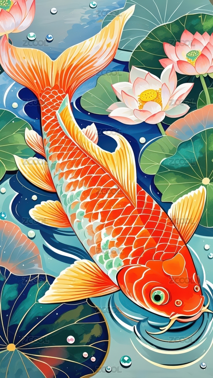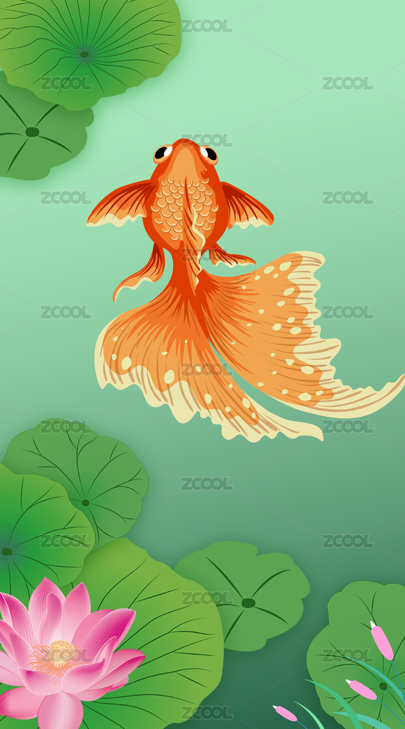 壁纸,装饰画,插画,金鱼,莲花,封面,贴纸,卡片,童装,印染图案