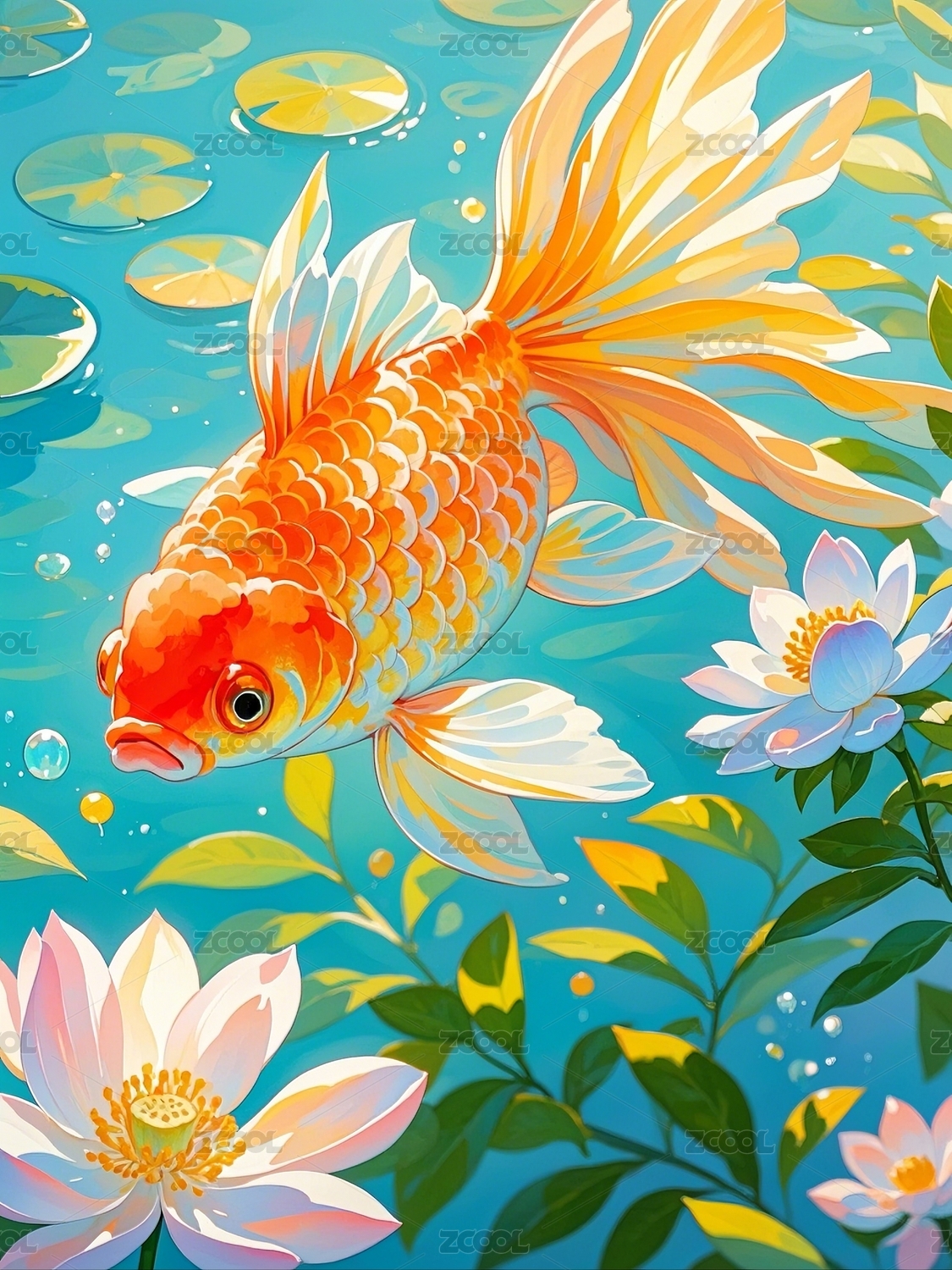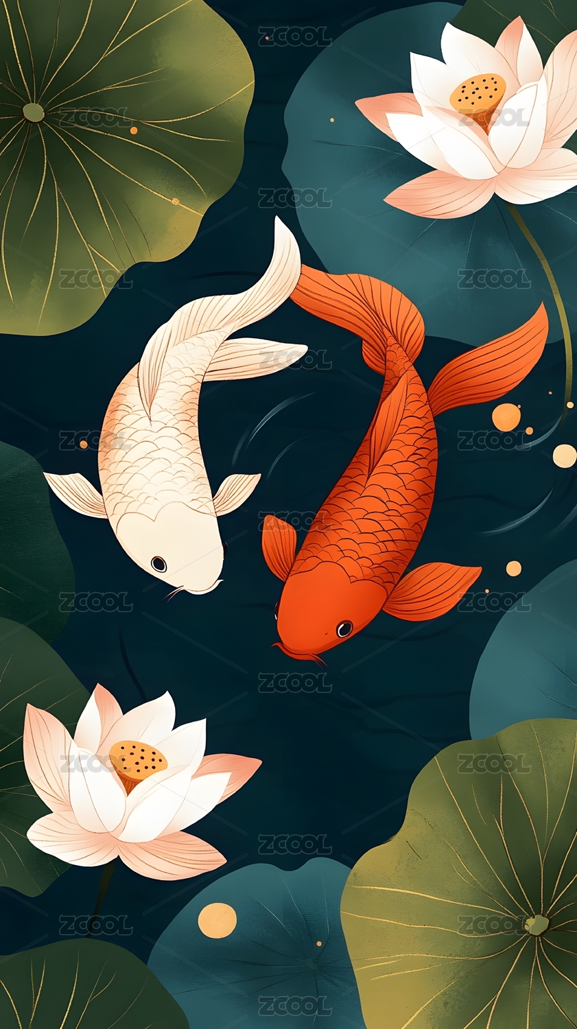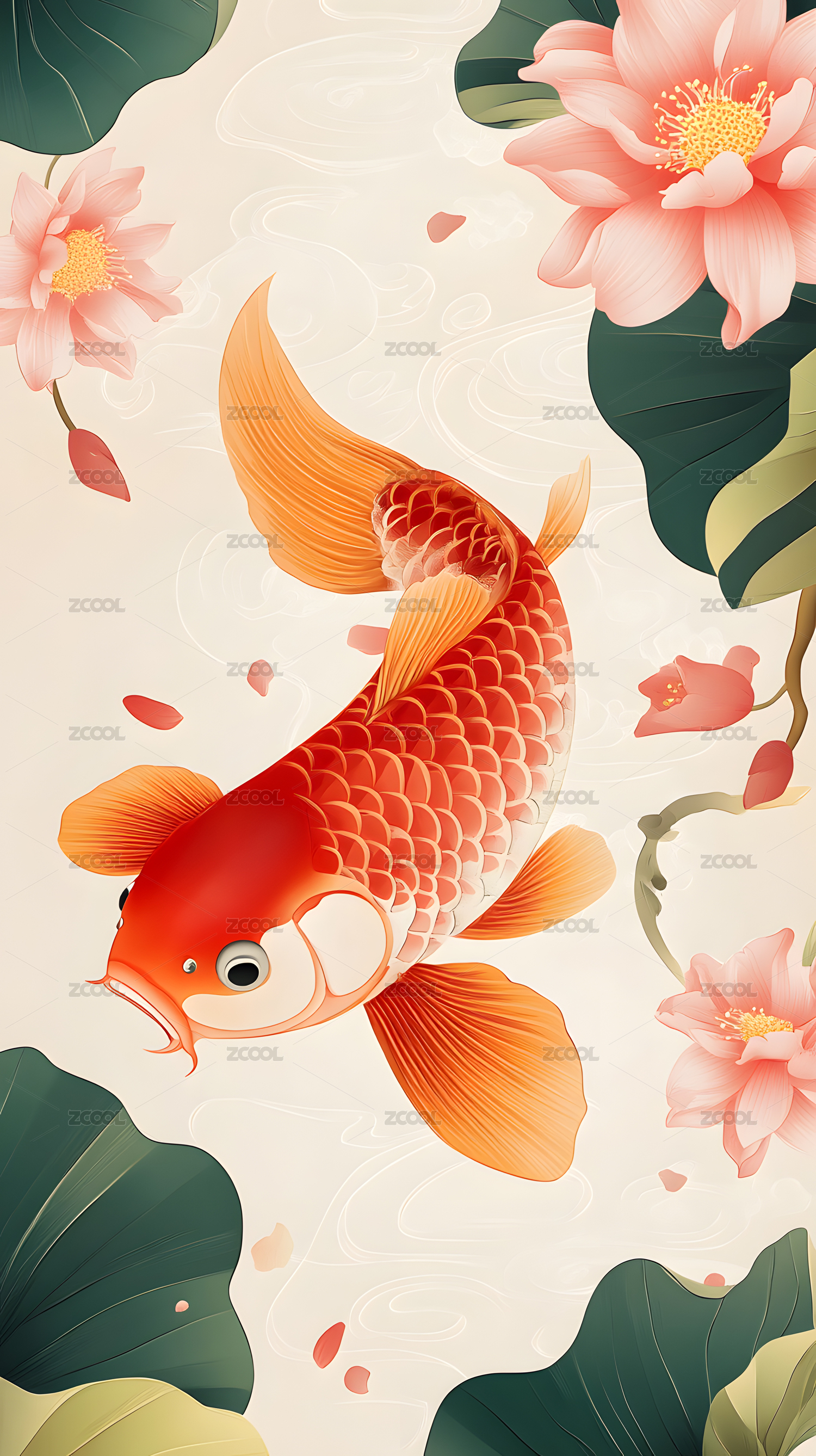 壁纸,装饰画,插画,金鱼,莲花,封面,贴纸,卡片,童装,印染图案