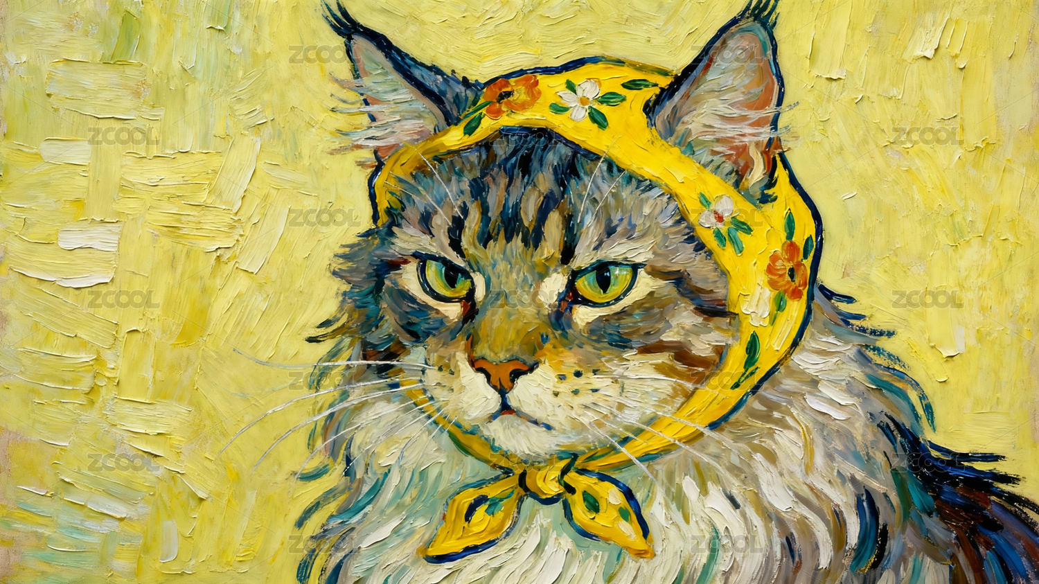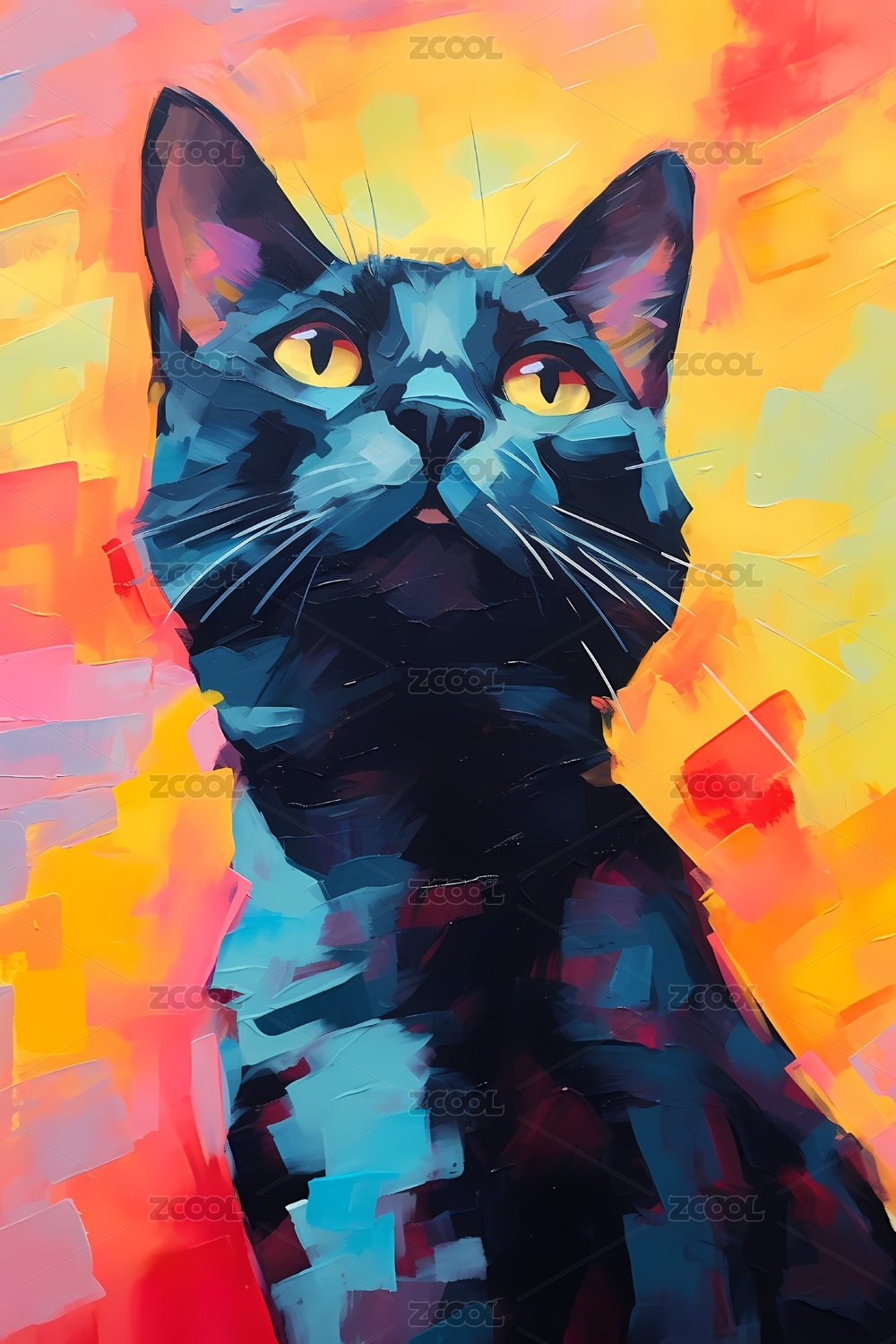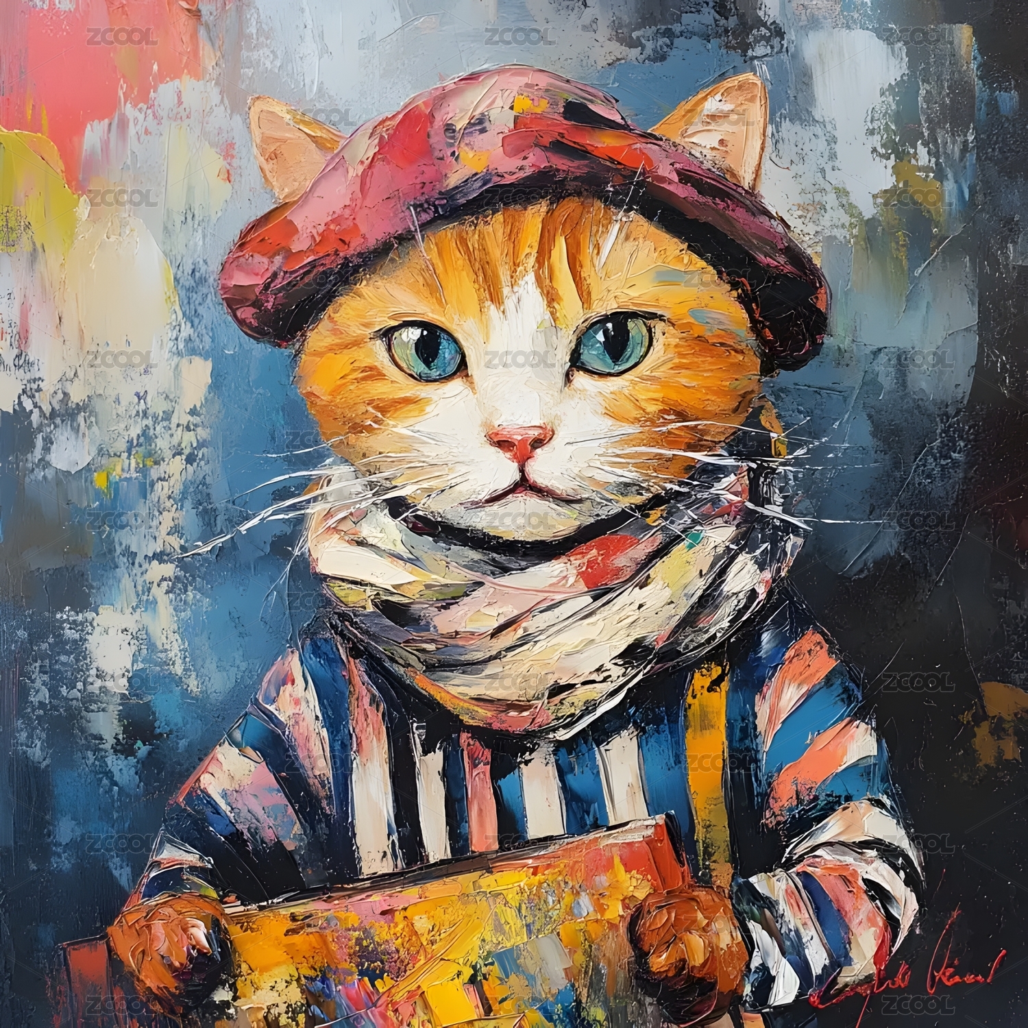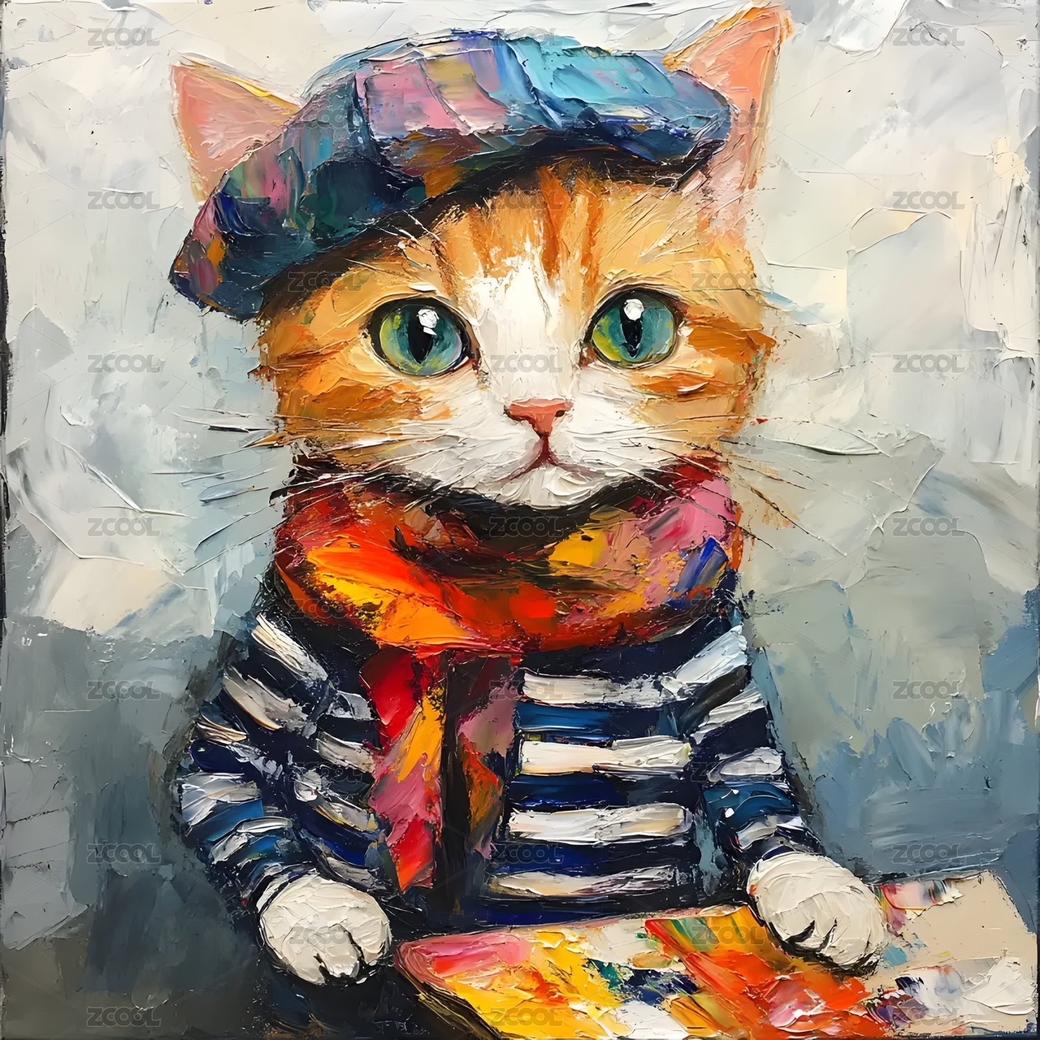 带珍珠耳环的猫宠物肖像画印象派装饰油画