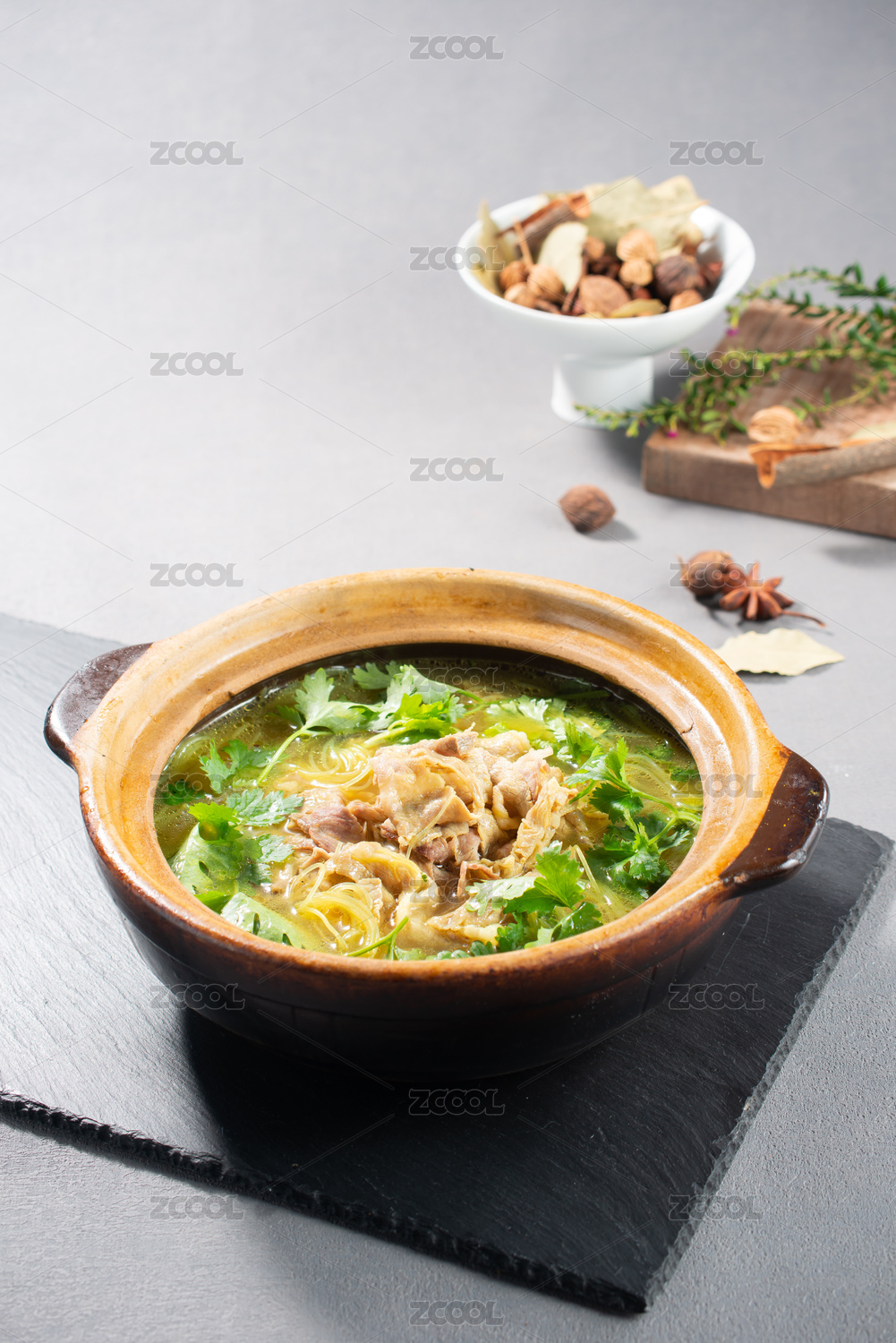 陈旧木板上的白瓷圆盘装的浓汤油菜烧菇片