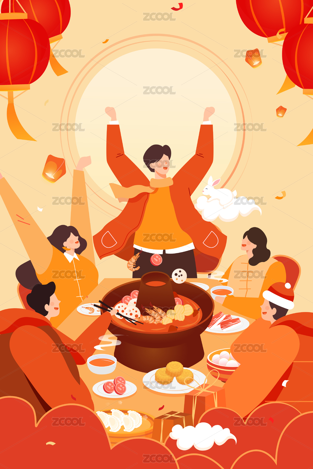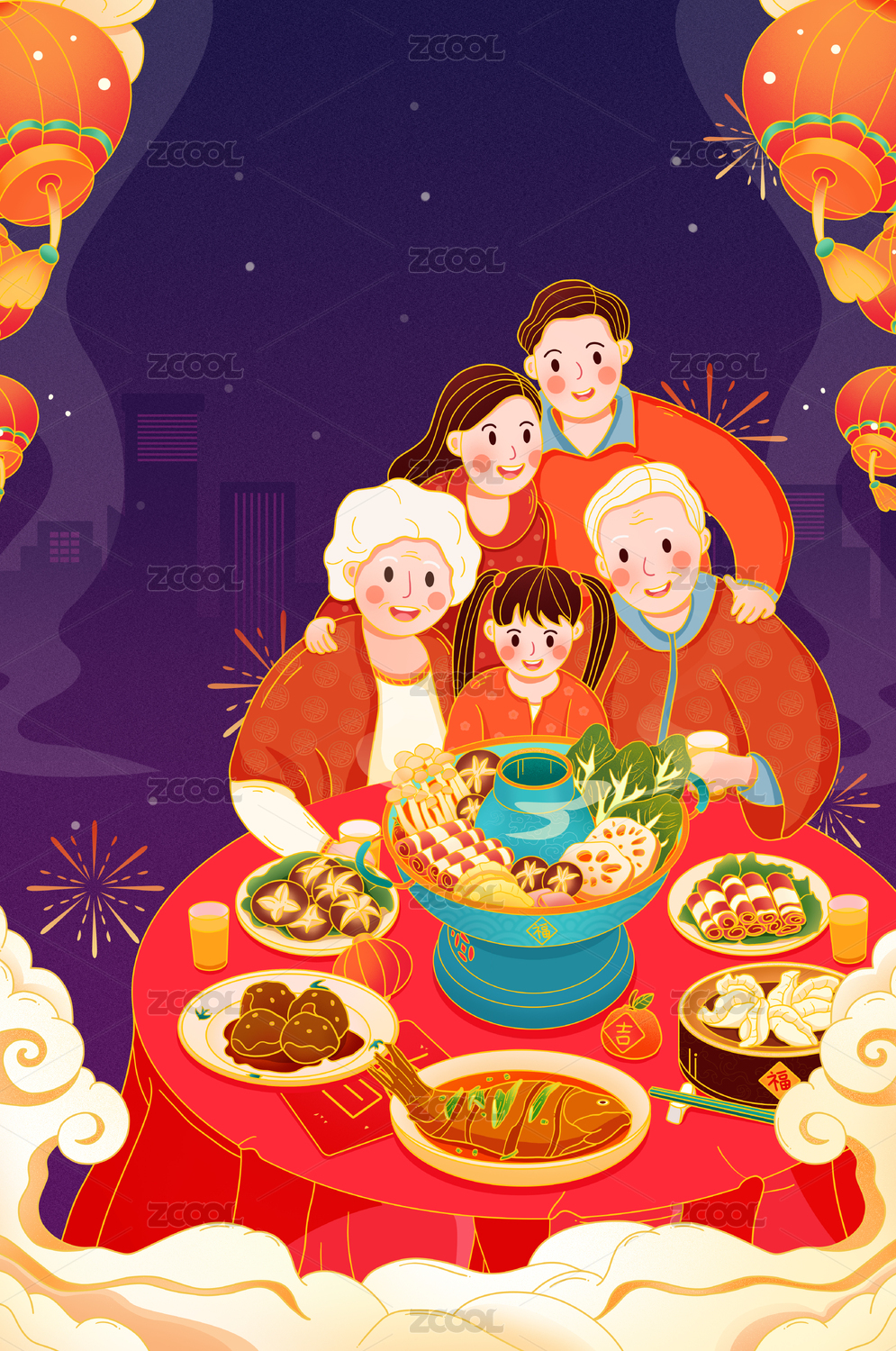 中秋节一家人团聚吃团圆饭海报传统节日插画