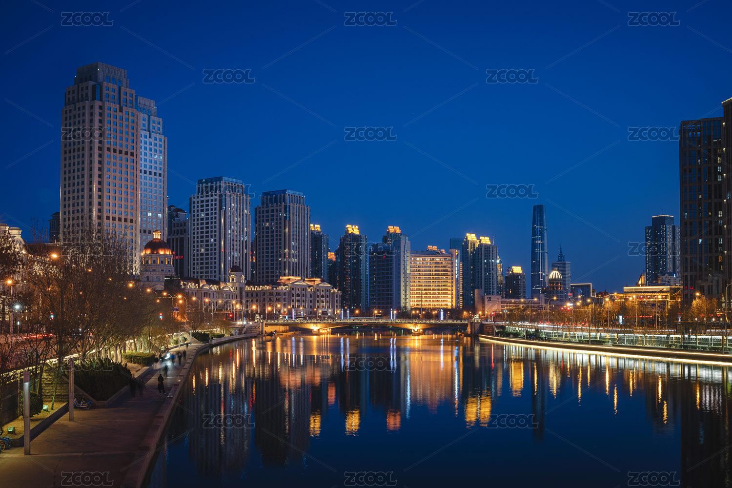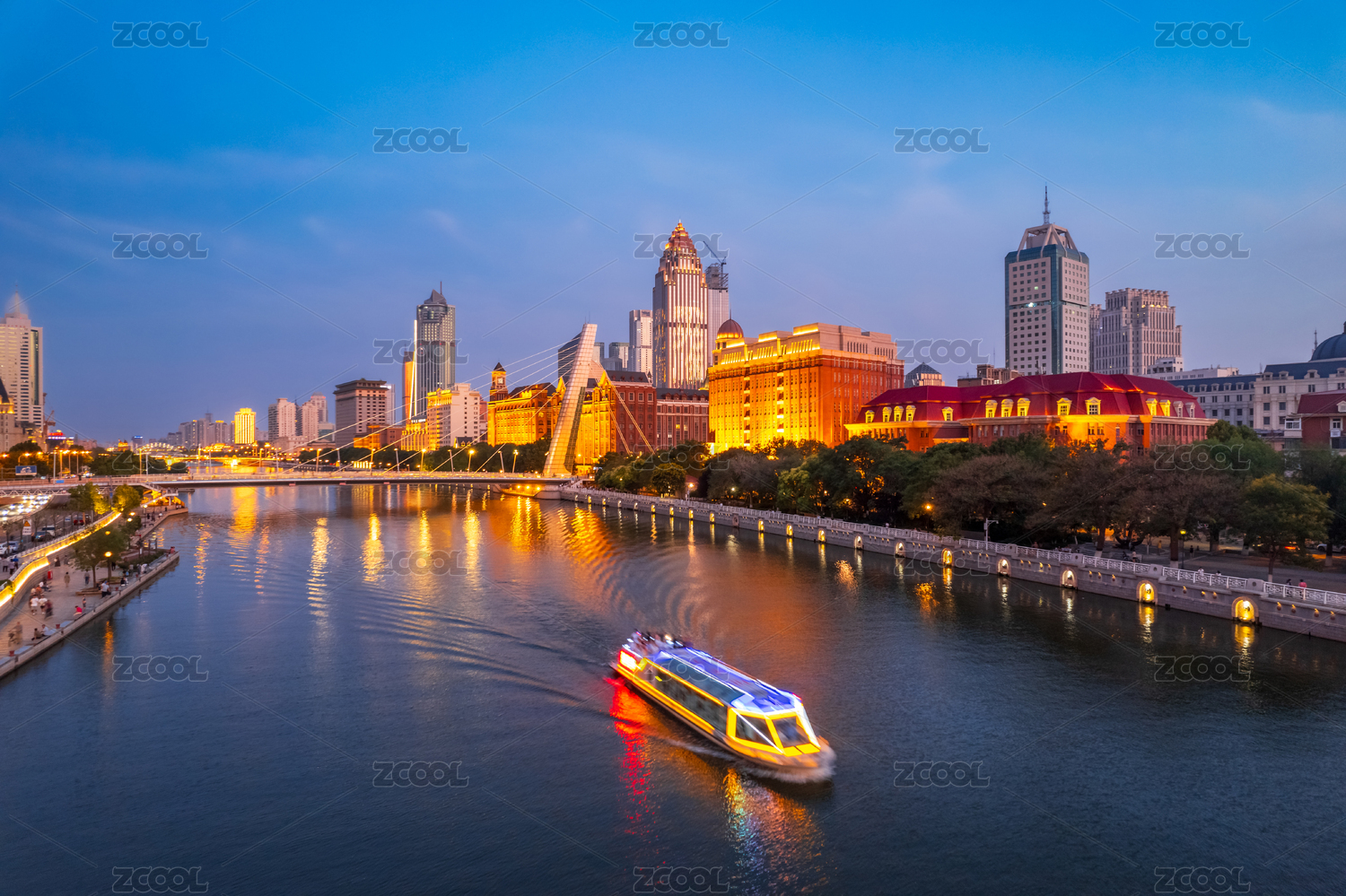 天津古文化街码头海河沿岸城市建筑日落夜景
