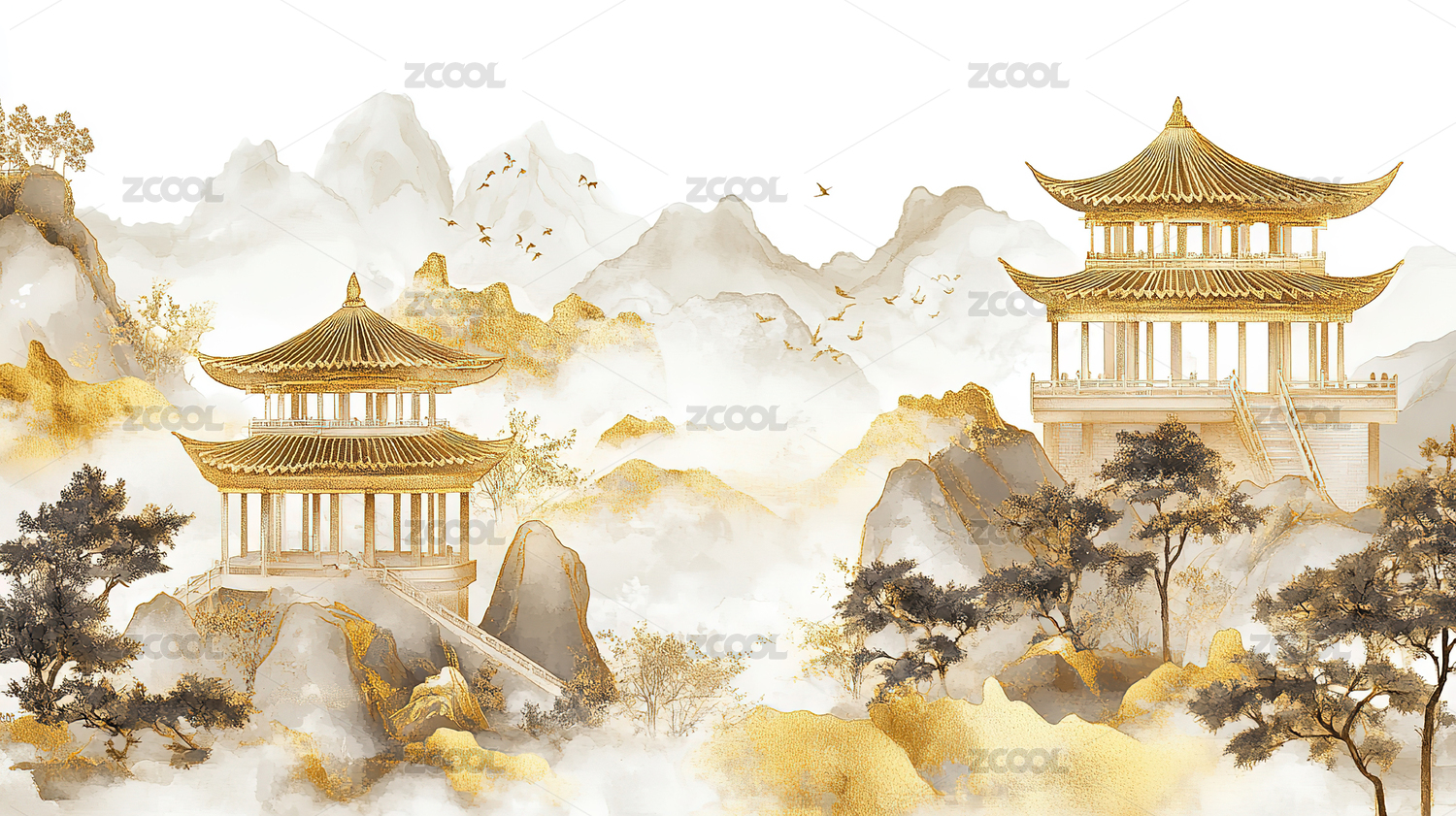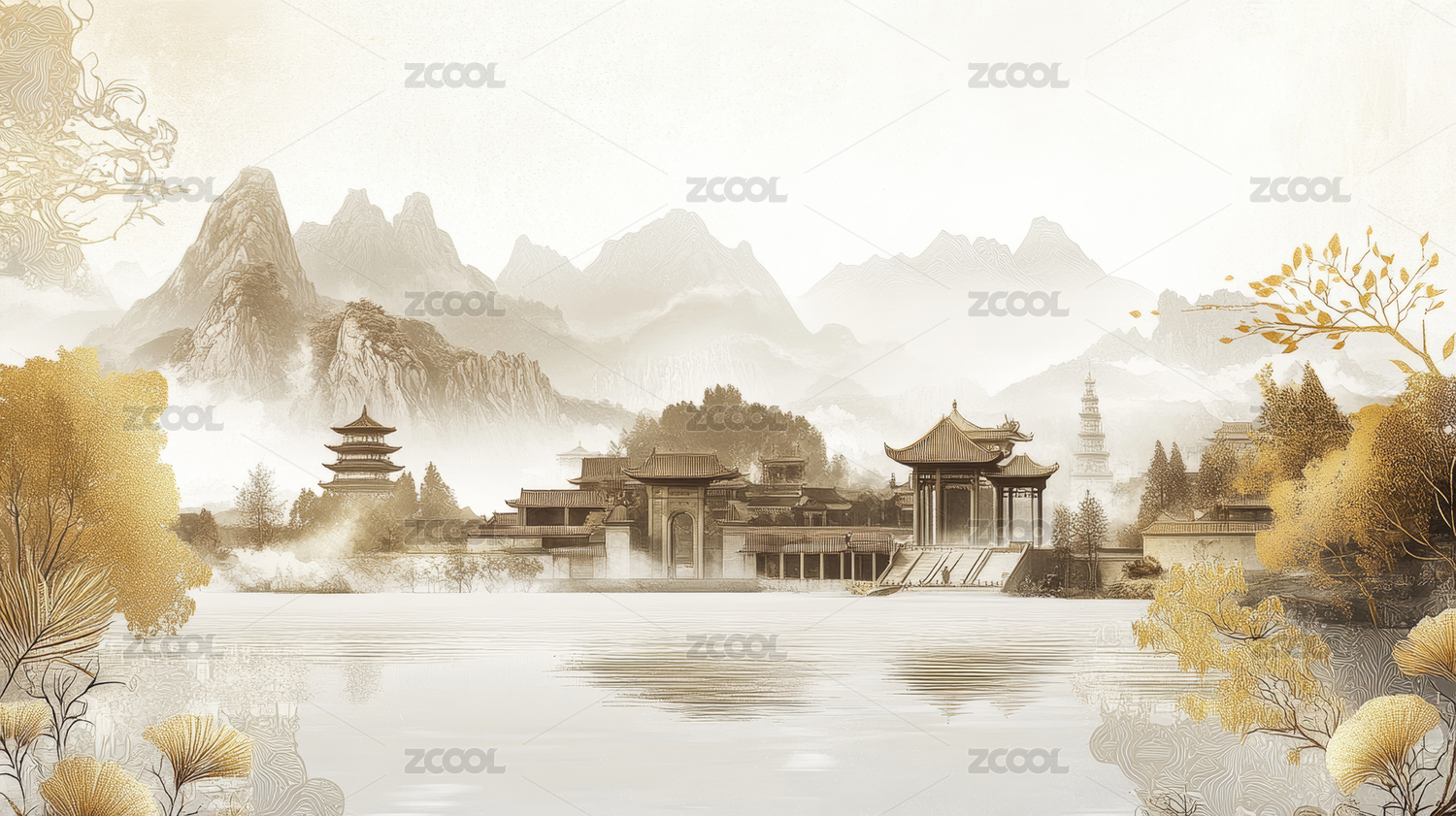 国风新中式水墨山水插画