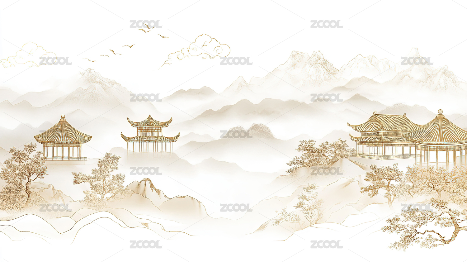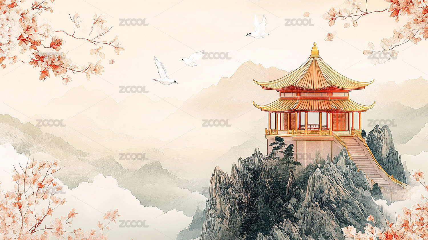 中国风,山水画,山顶,亭子,白云,柔和,色彩,空灵,极简主义,背景