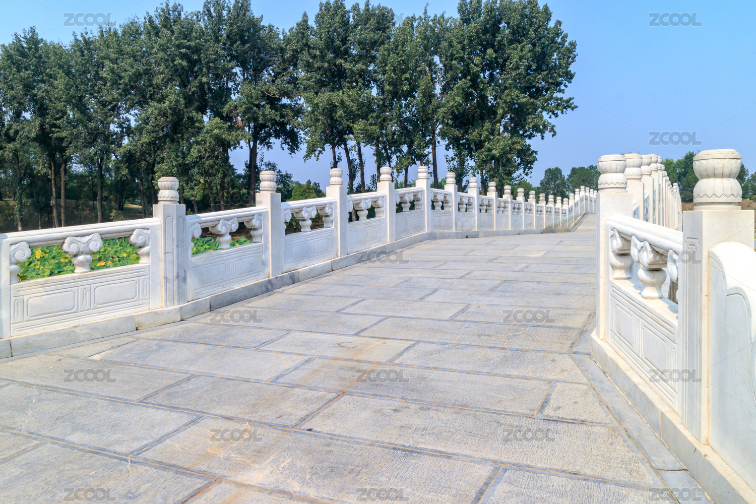 晴天里蓝天下的白色石桥、红色桥面以及栏杆