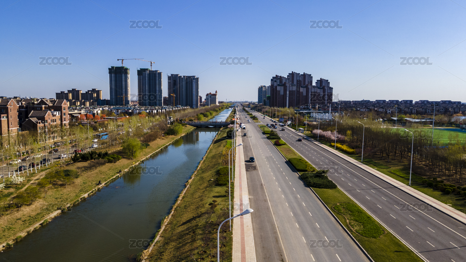 航拍山东东营市东营区绿色生态城市建筑公路风光