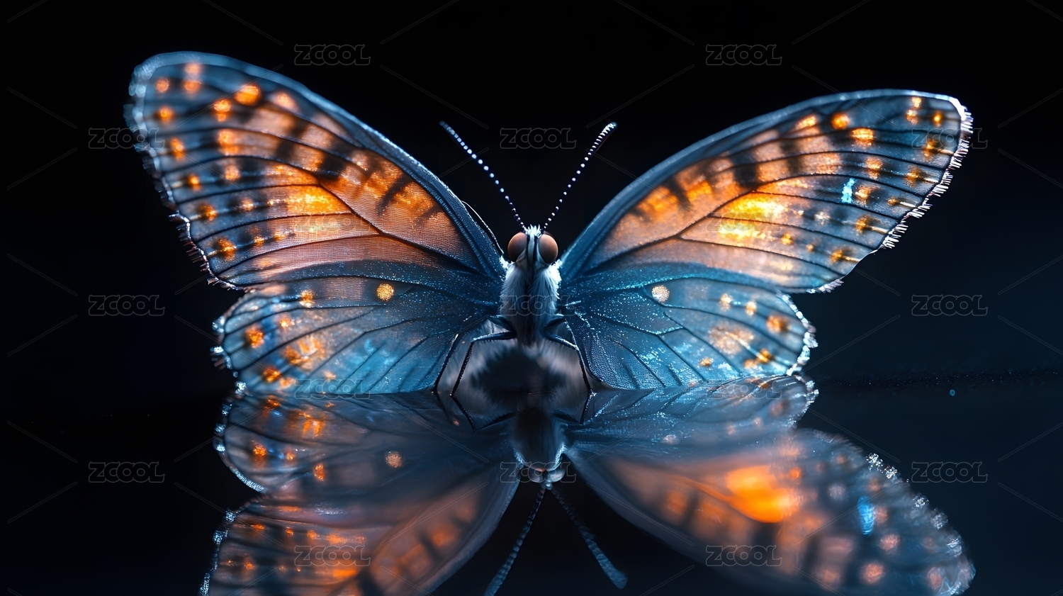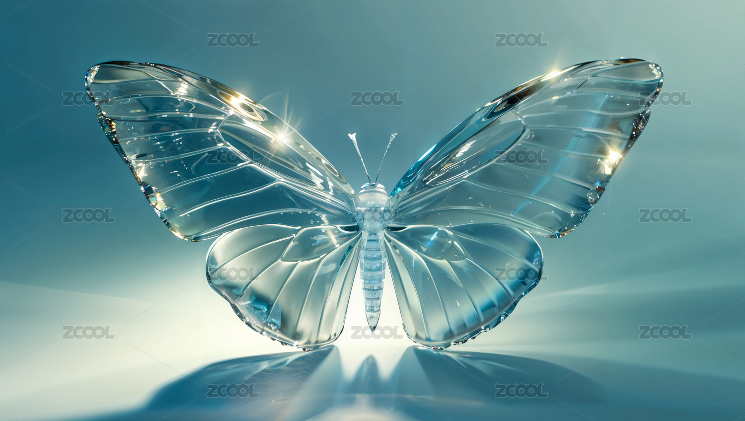 唯美蓝色逆光中的透明水晶蝴蝶翅膀特写