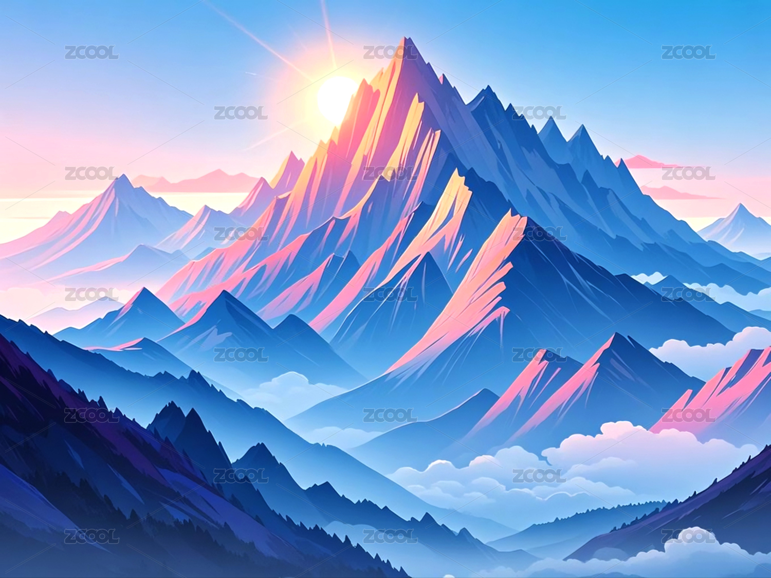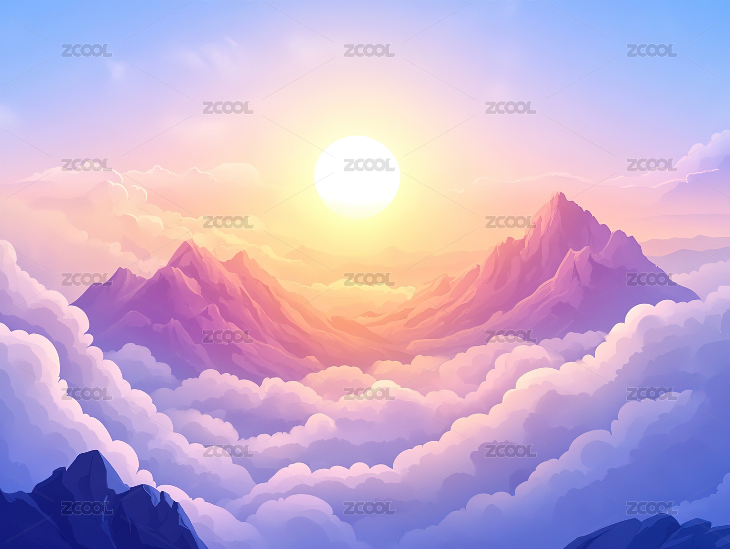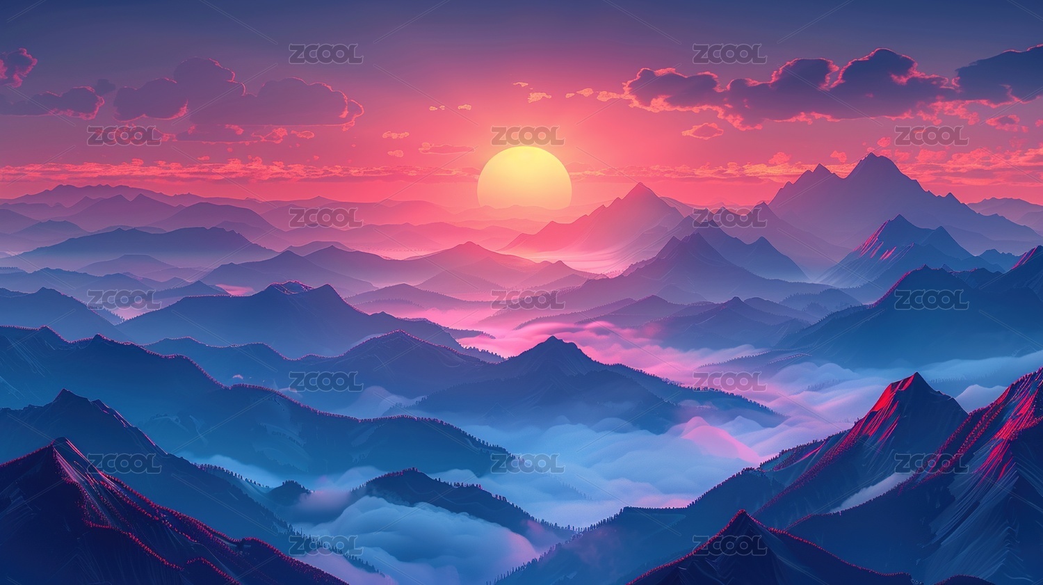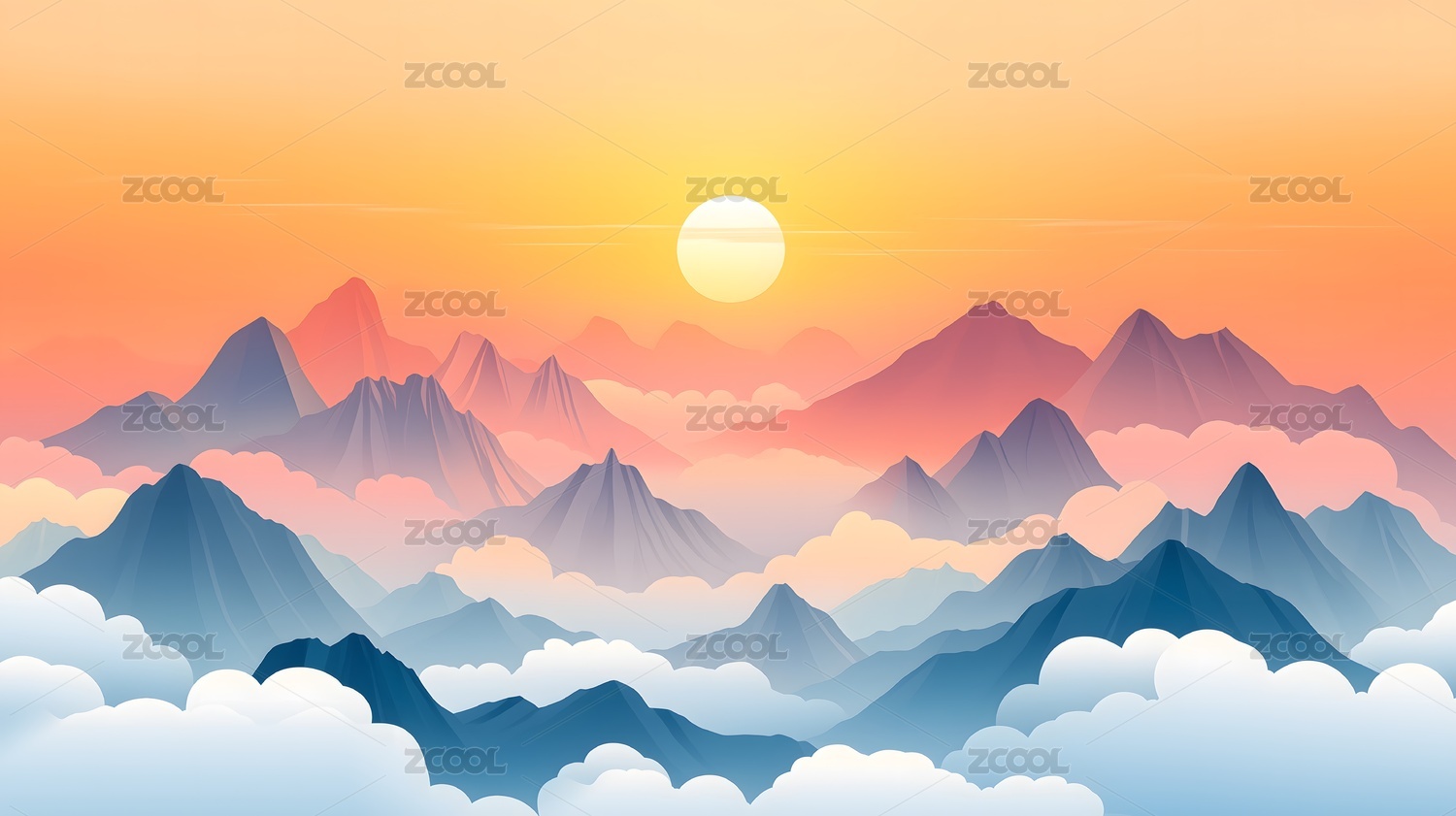 插画远山云彩日出渐变风景