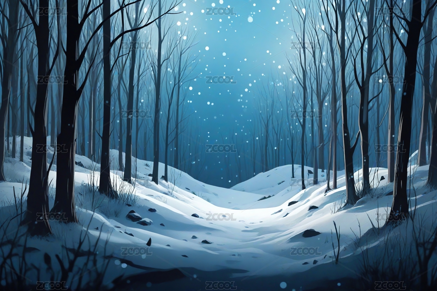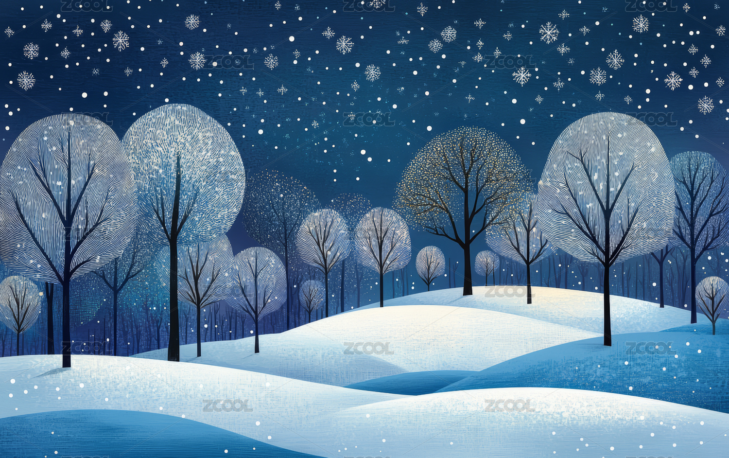 唯美的蓝色冬季雪景艺术插画