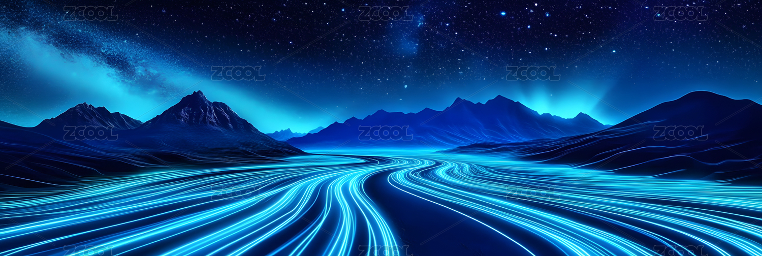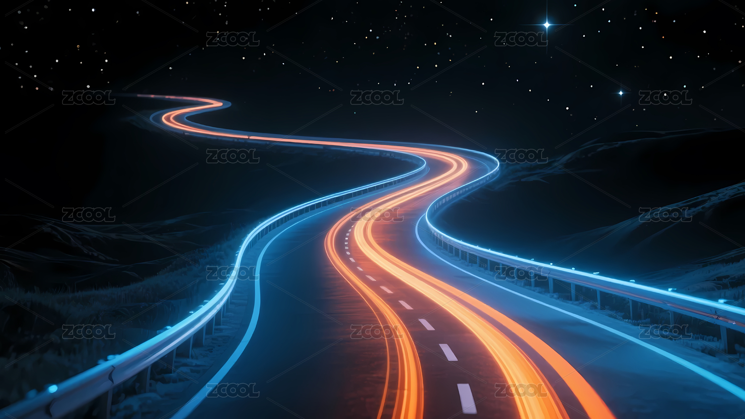 星光璀璨之路,蜿蜒山间,梦幻蓝光点缀