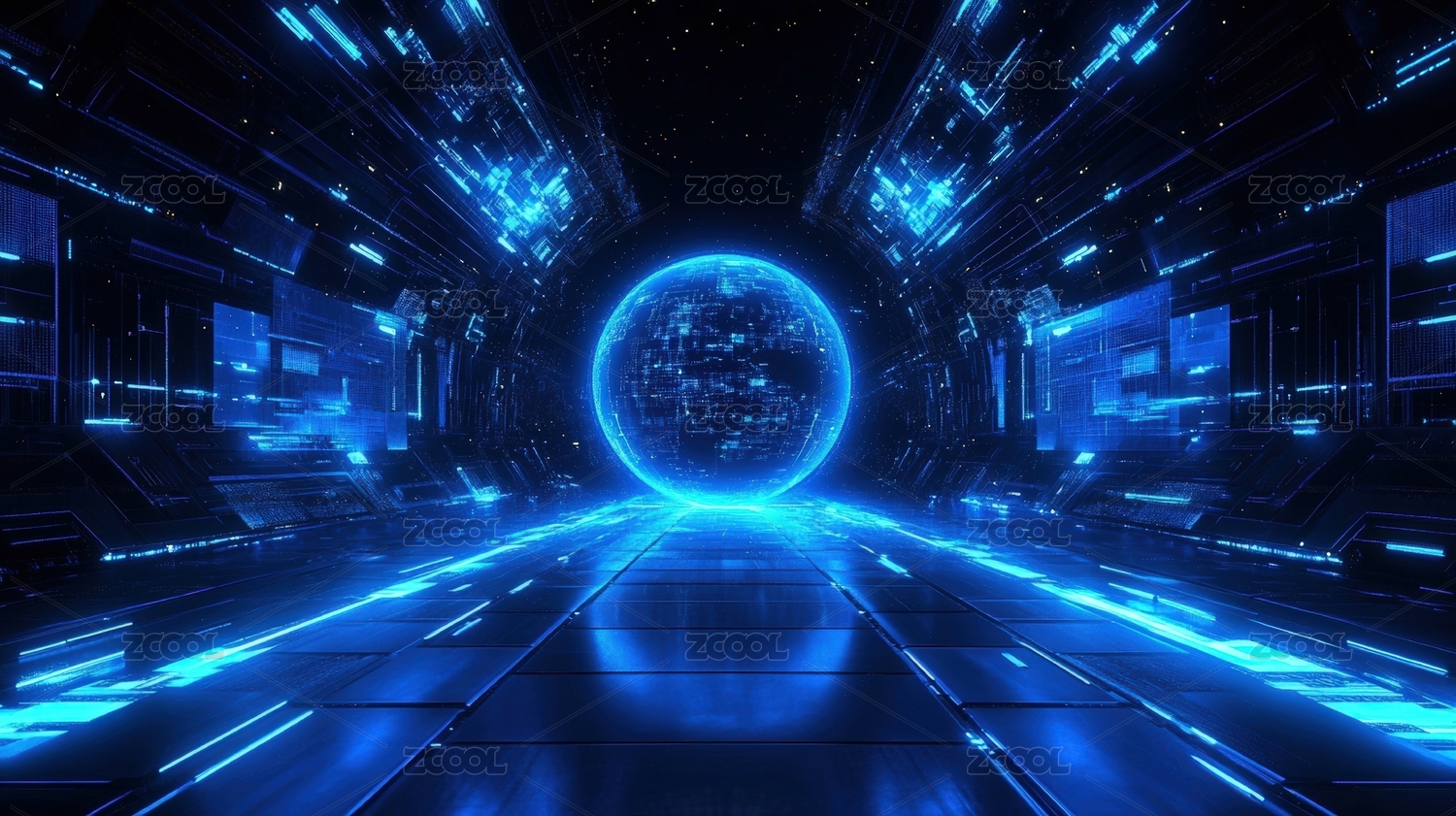 未来科幻走廊里的悬浮能量核心