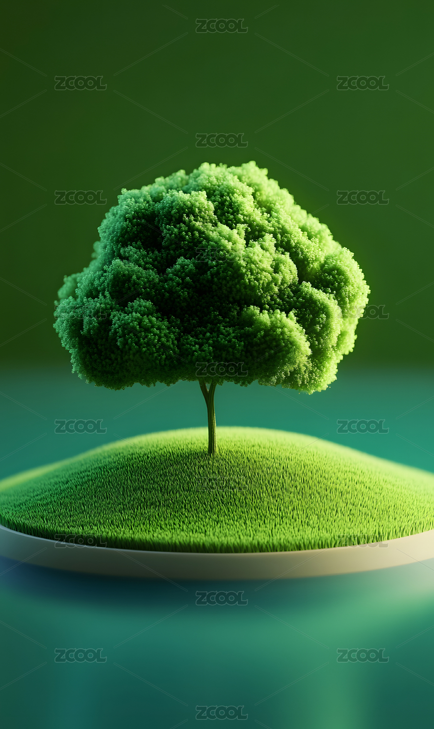 绿色波浪起伏丘陵地貌,点缀两棵绿色小树