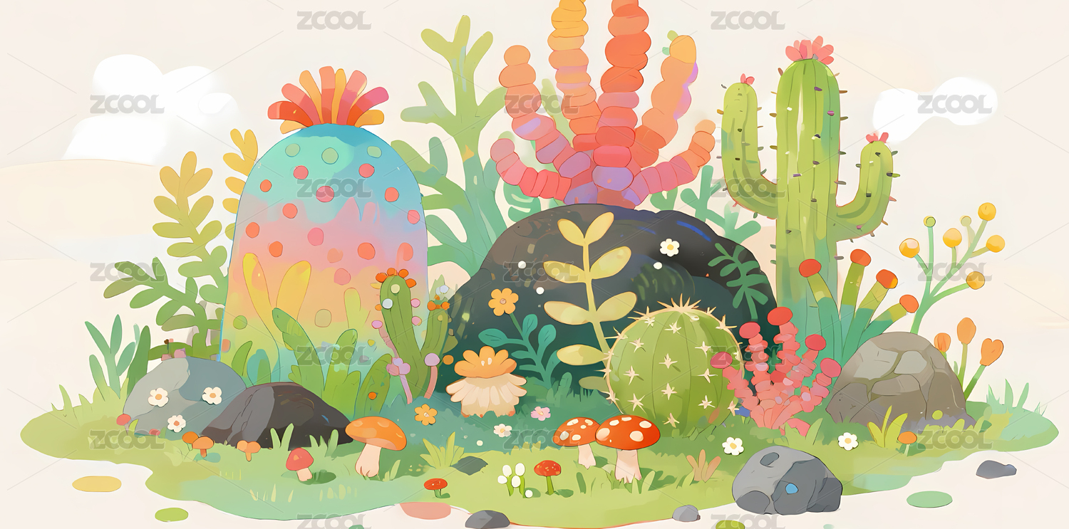 多彩仙人掌与蘑菇的奇幻花园