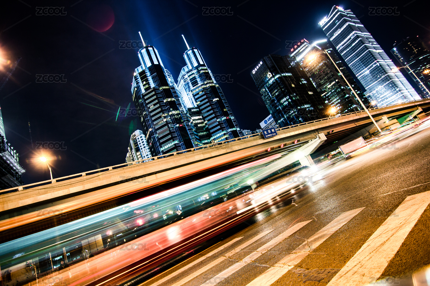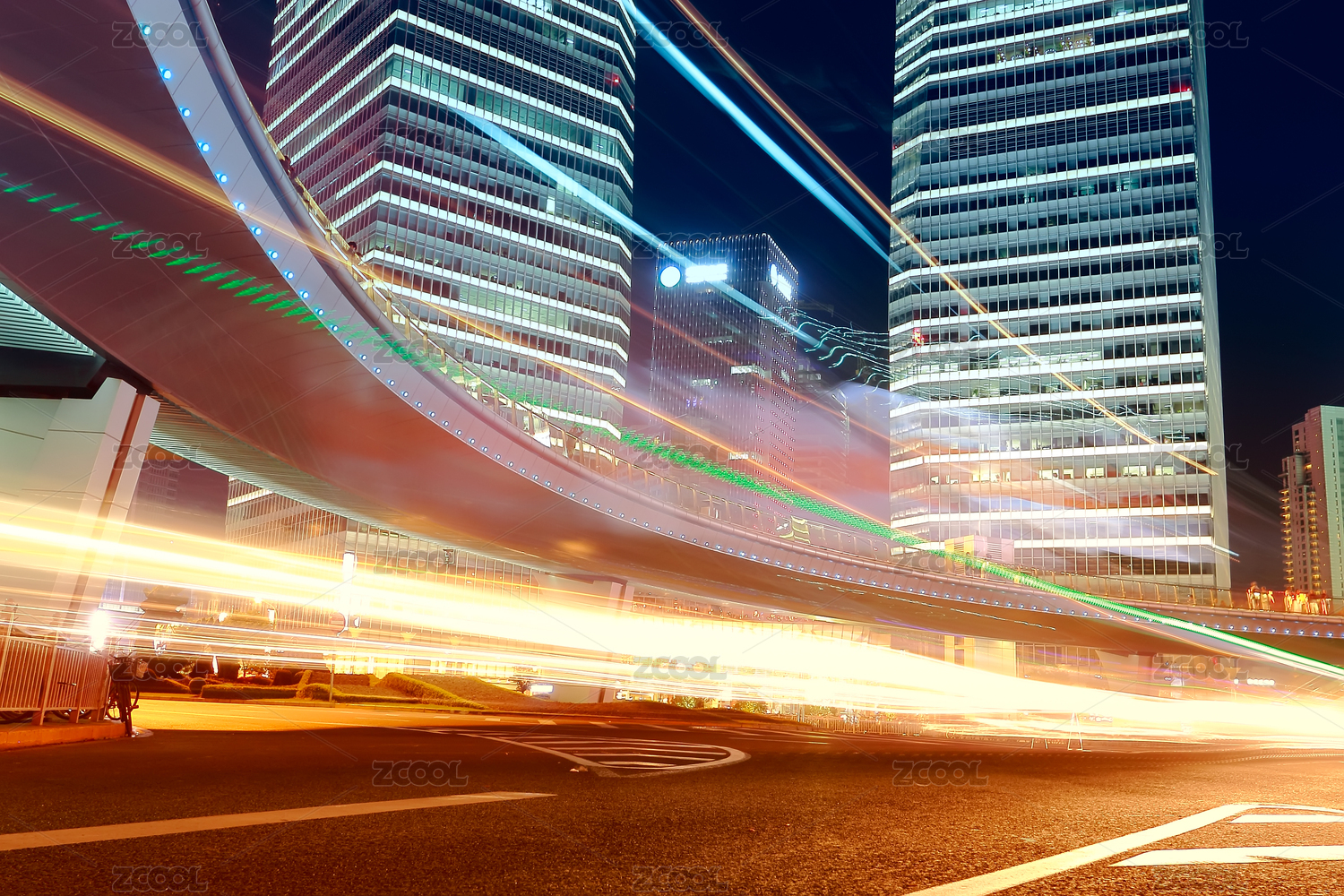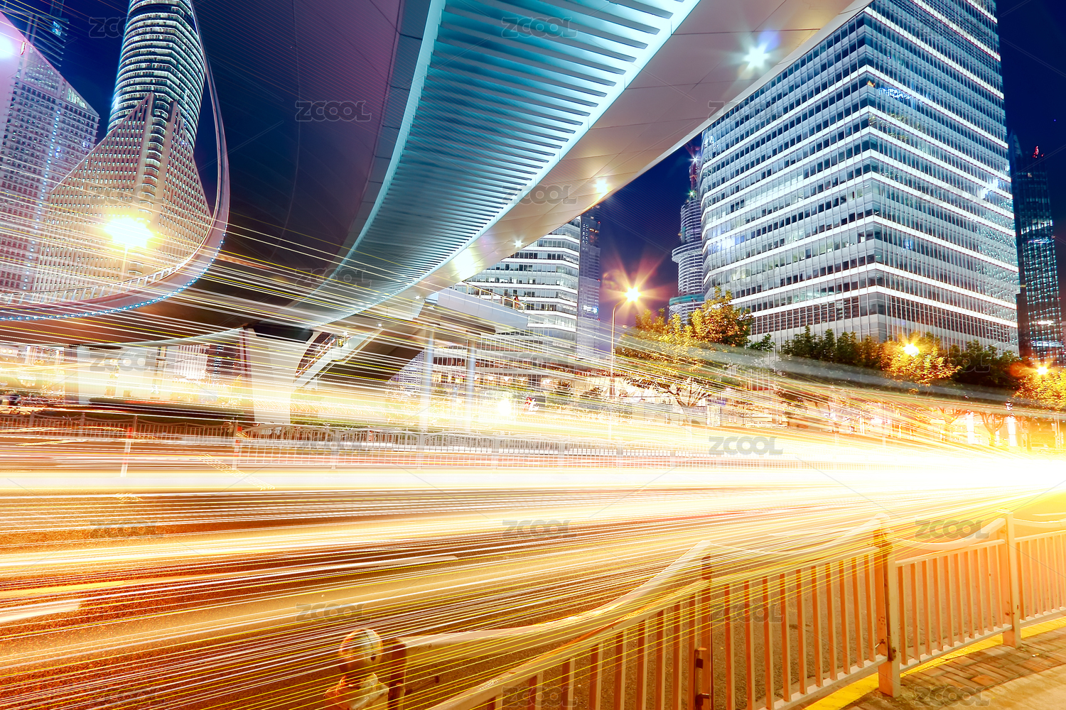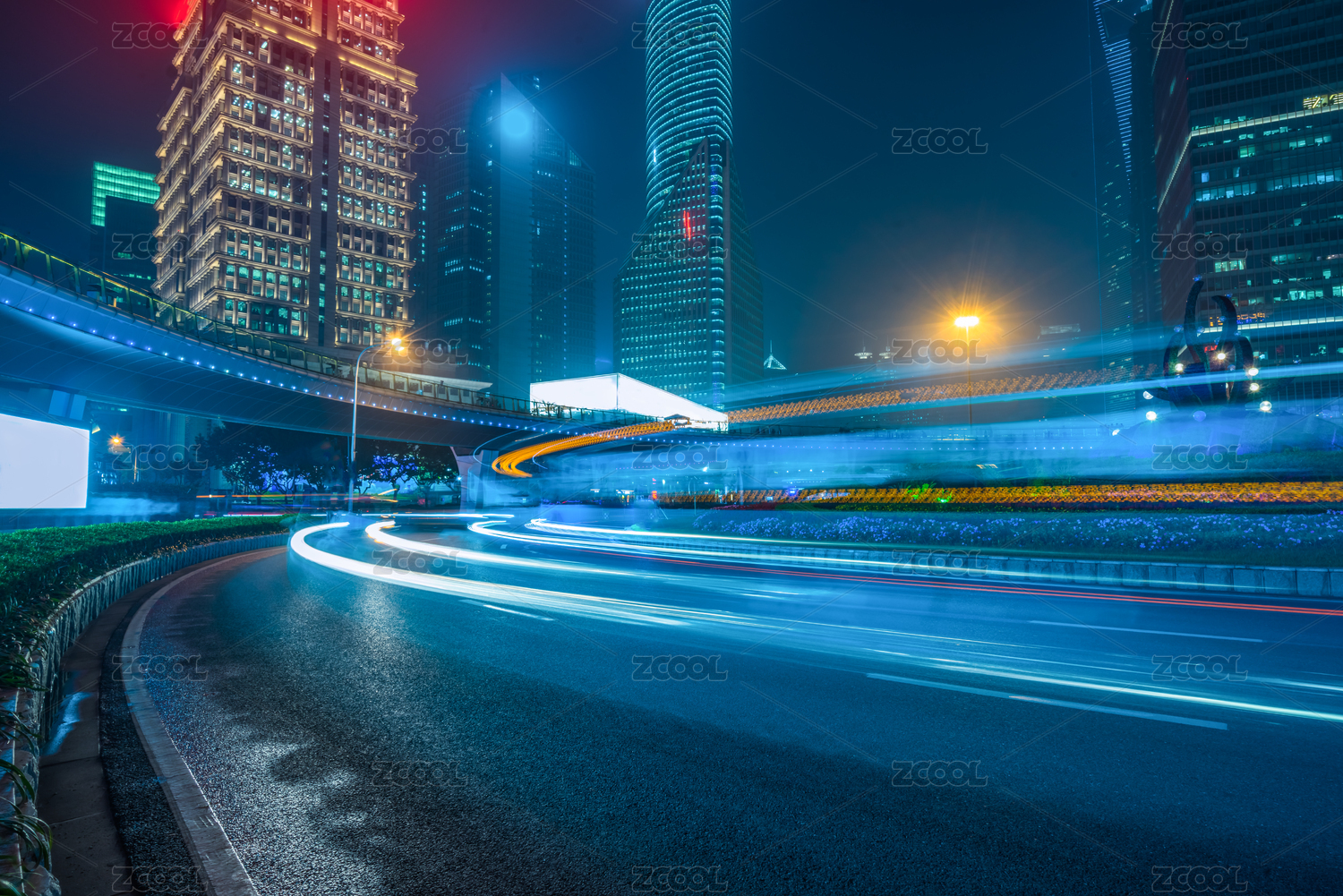 上海城市夜景立交桥,飞驰的汽车尾灯形成的光的轨迹
