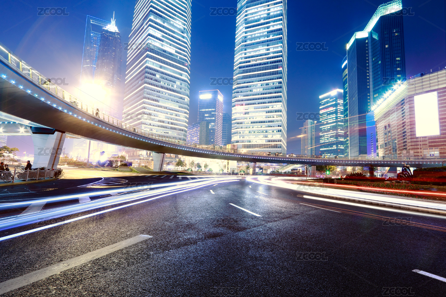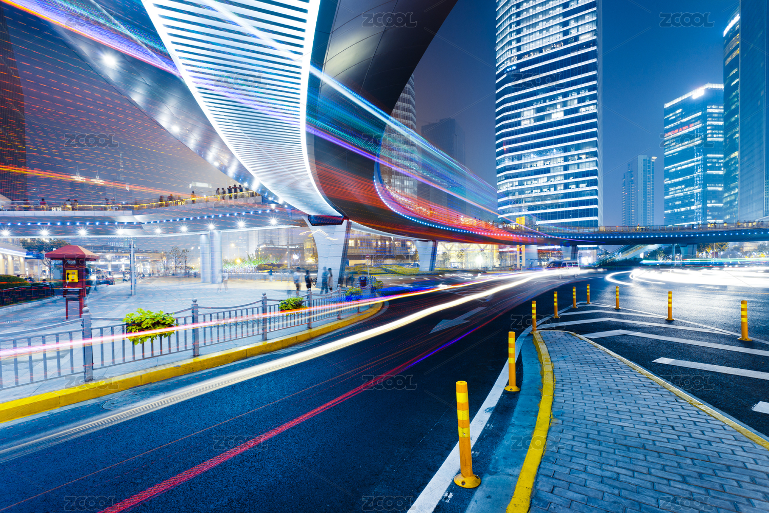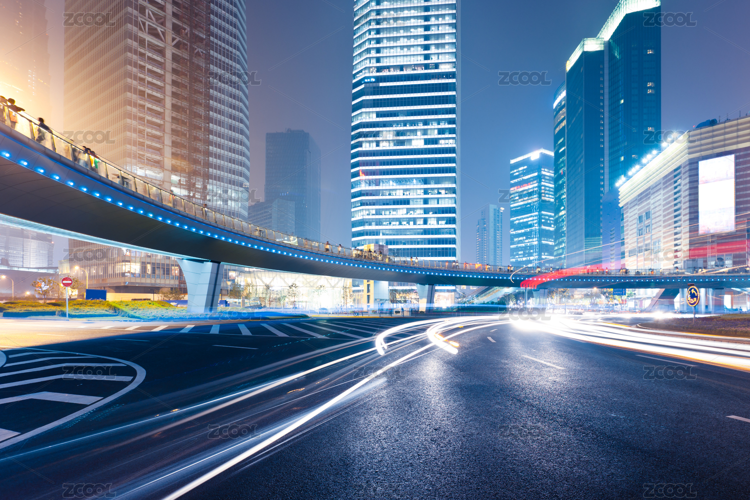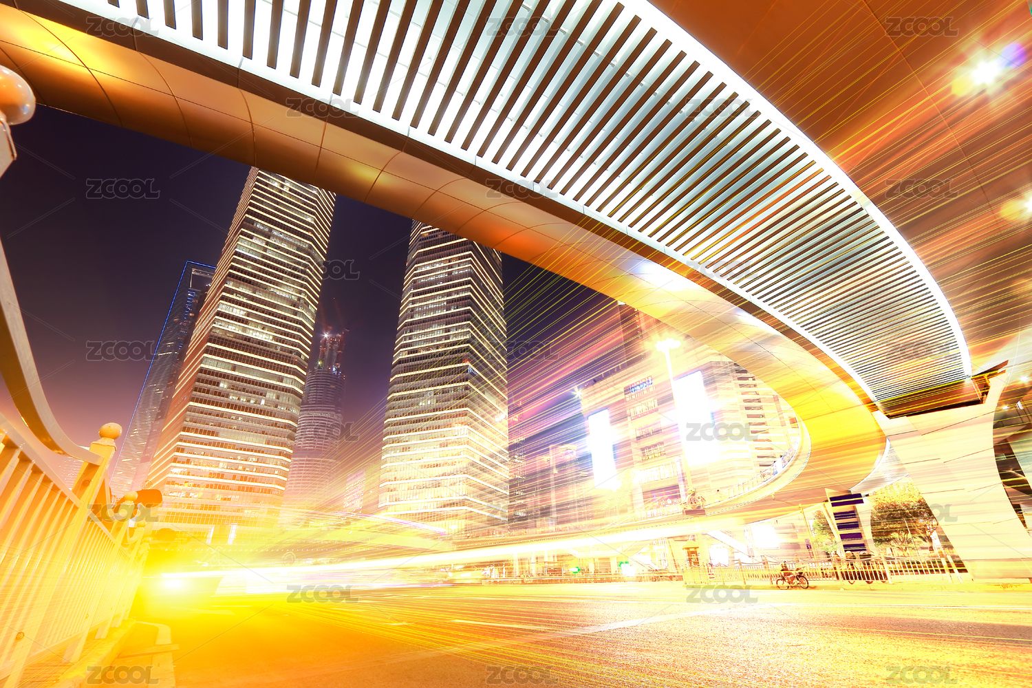 上海城市夜景立交桥,飞驰的汽车尾灯形成的光的轨迹
