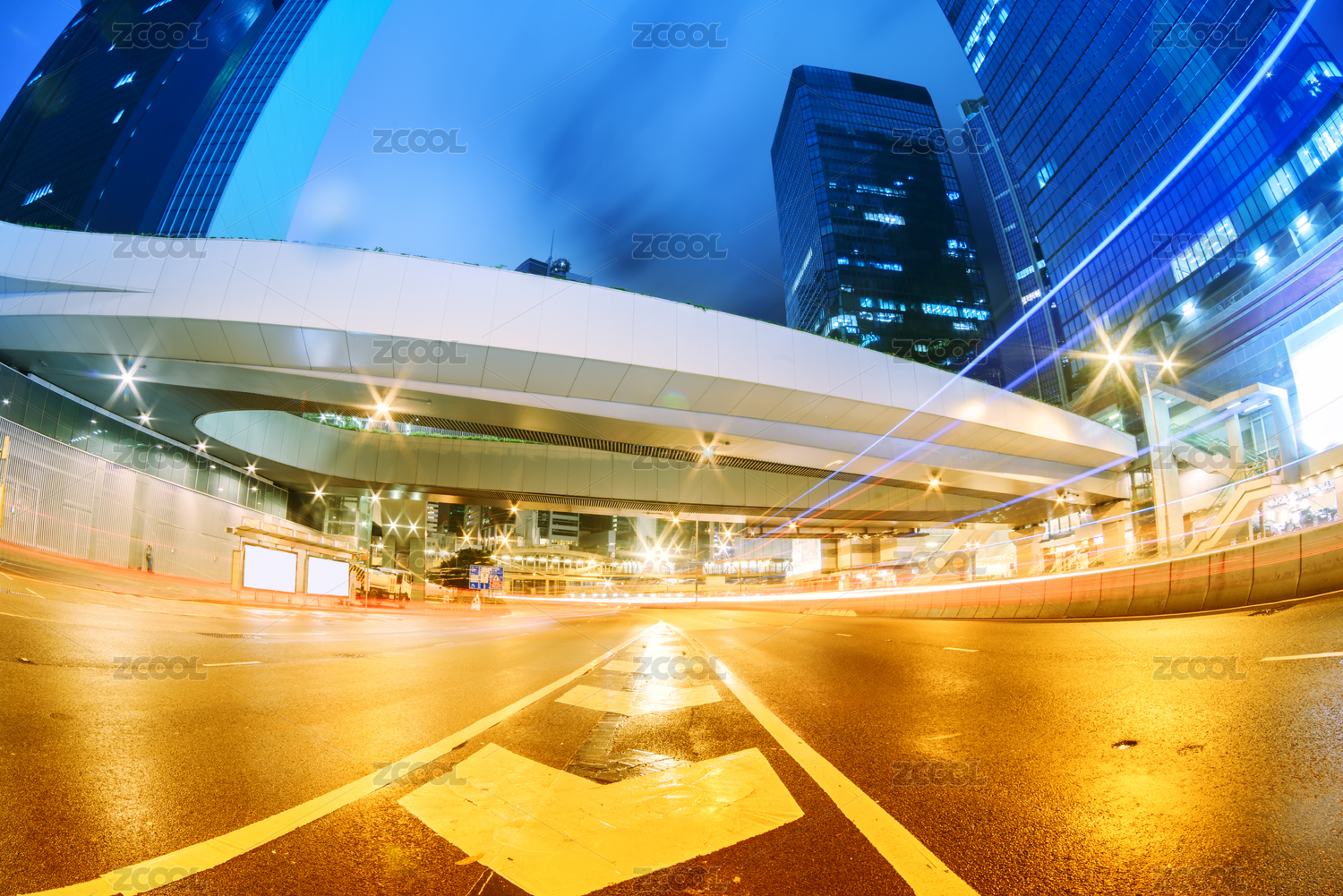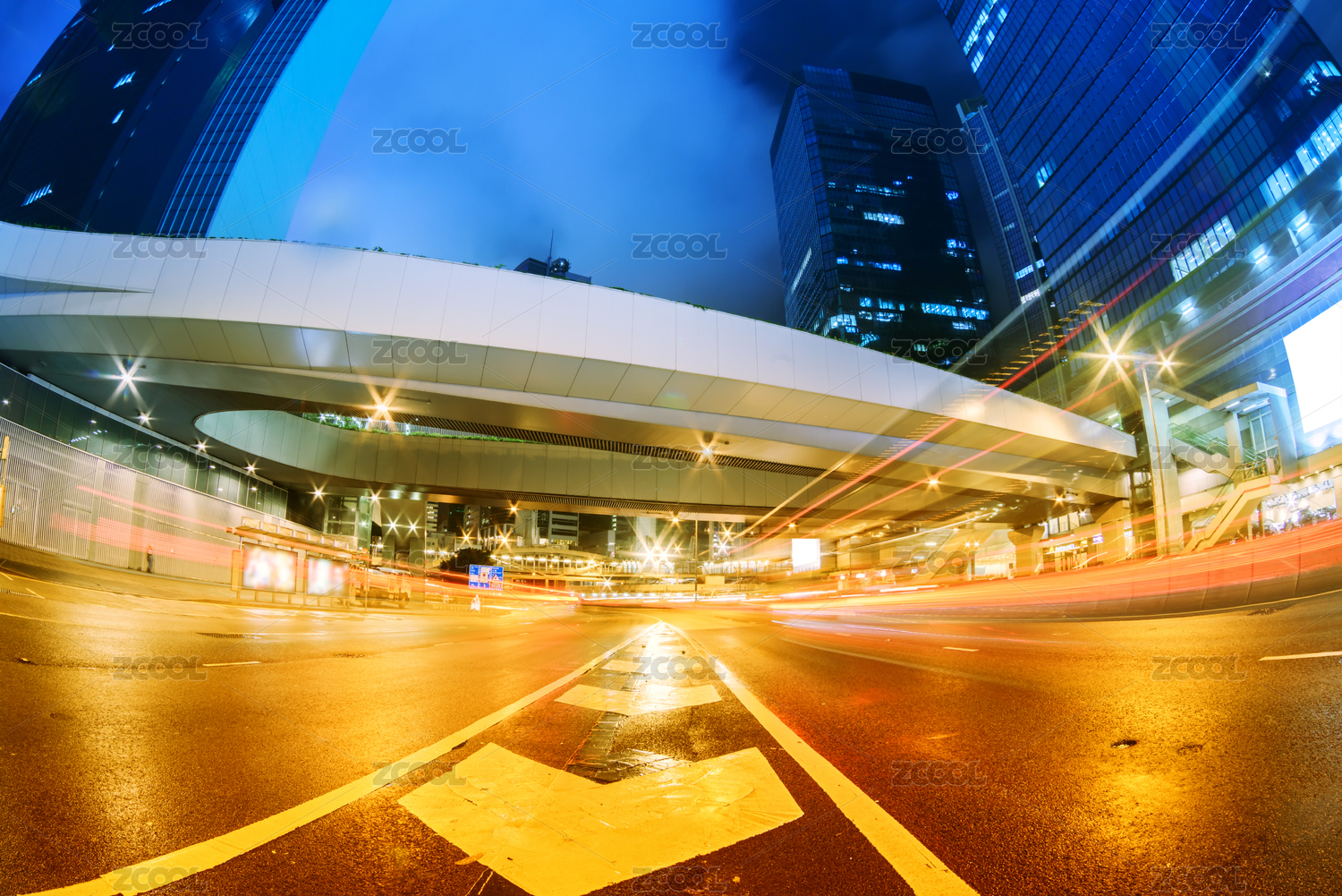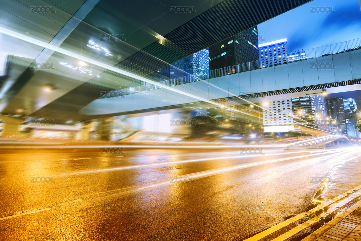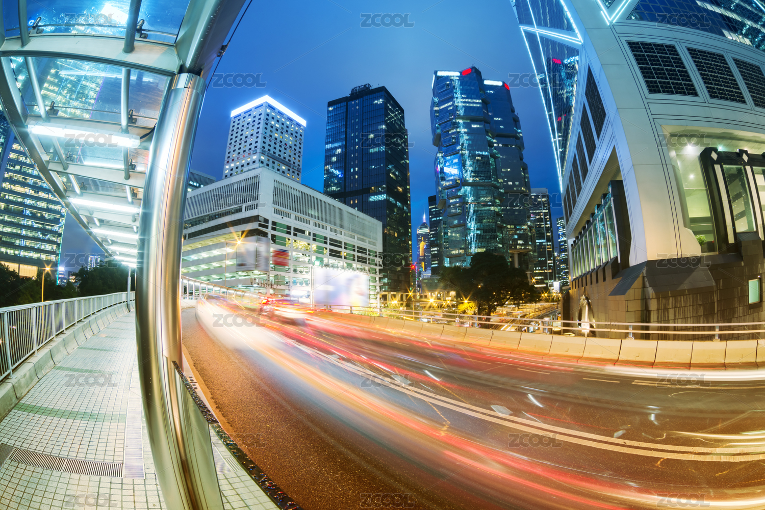 香港夜景,飞驰的汽车尾灯形成的光的轨迹