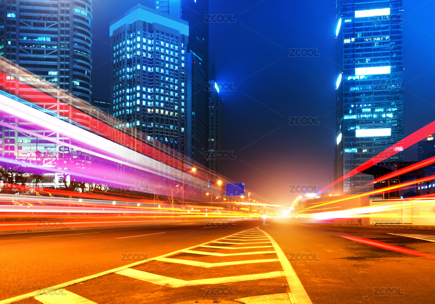 上海城市夜景,飞驰的汽车尾灯形成的光的轨迹