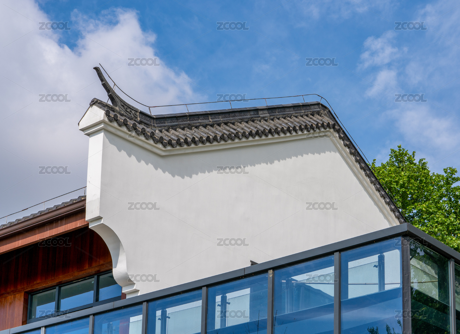蓝色天空下徽派建筑白墙黑色屋檐的局部