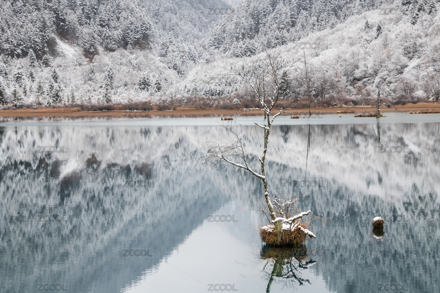 中国四川阿坝九寨沟镜海冬季雪后风光