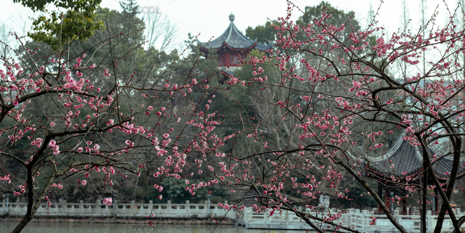 春天公园中的古建筑中盛开的梅花