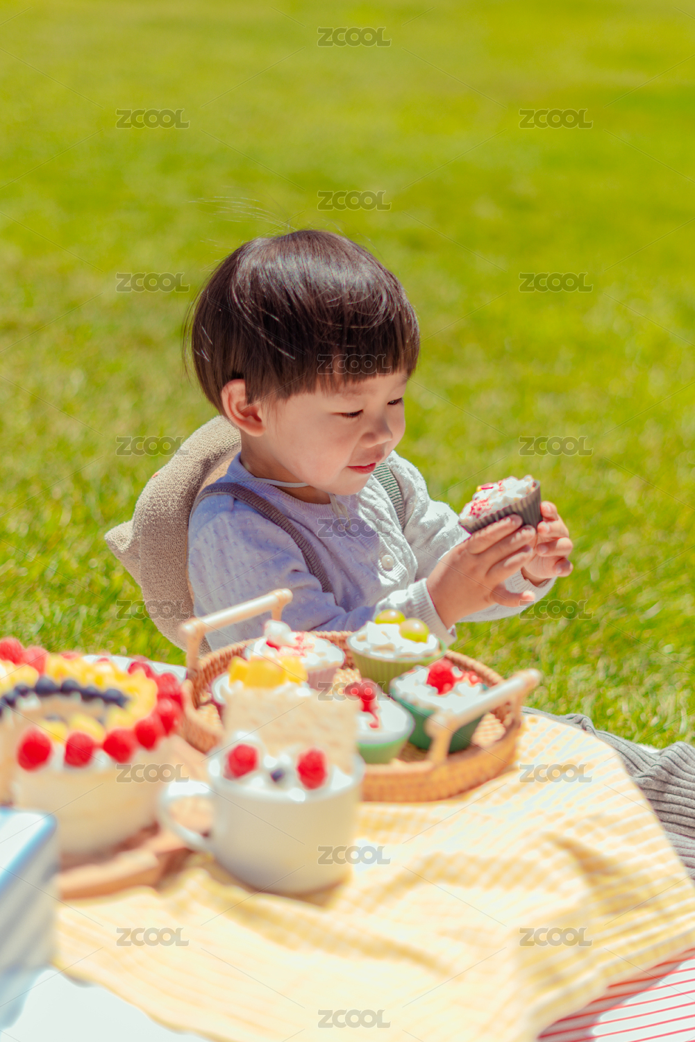 野外草坪上小寿星享受吃生日蛋糕的喜悦