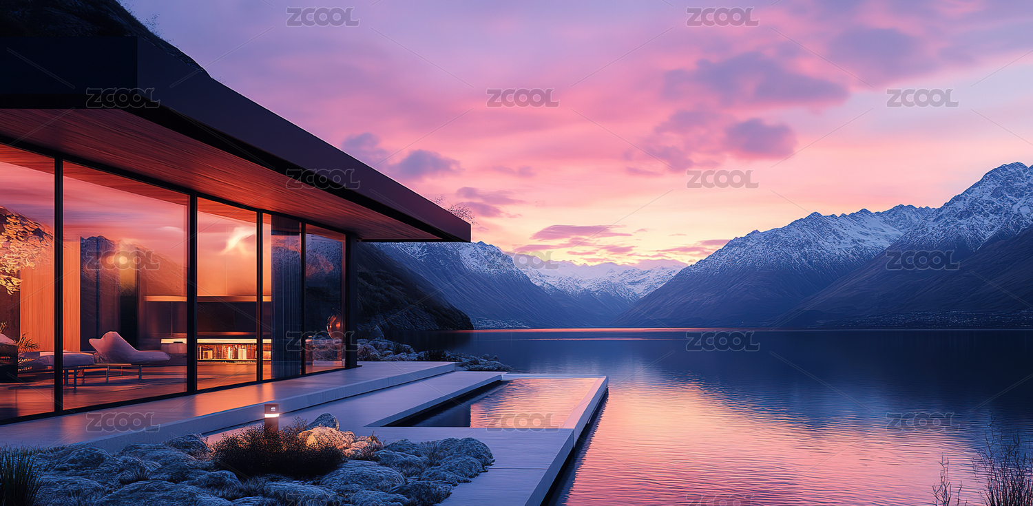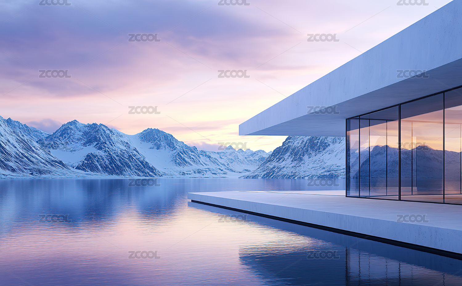 数码白色雪山蓝天水面建筑场景图形