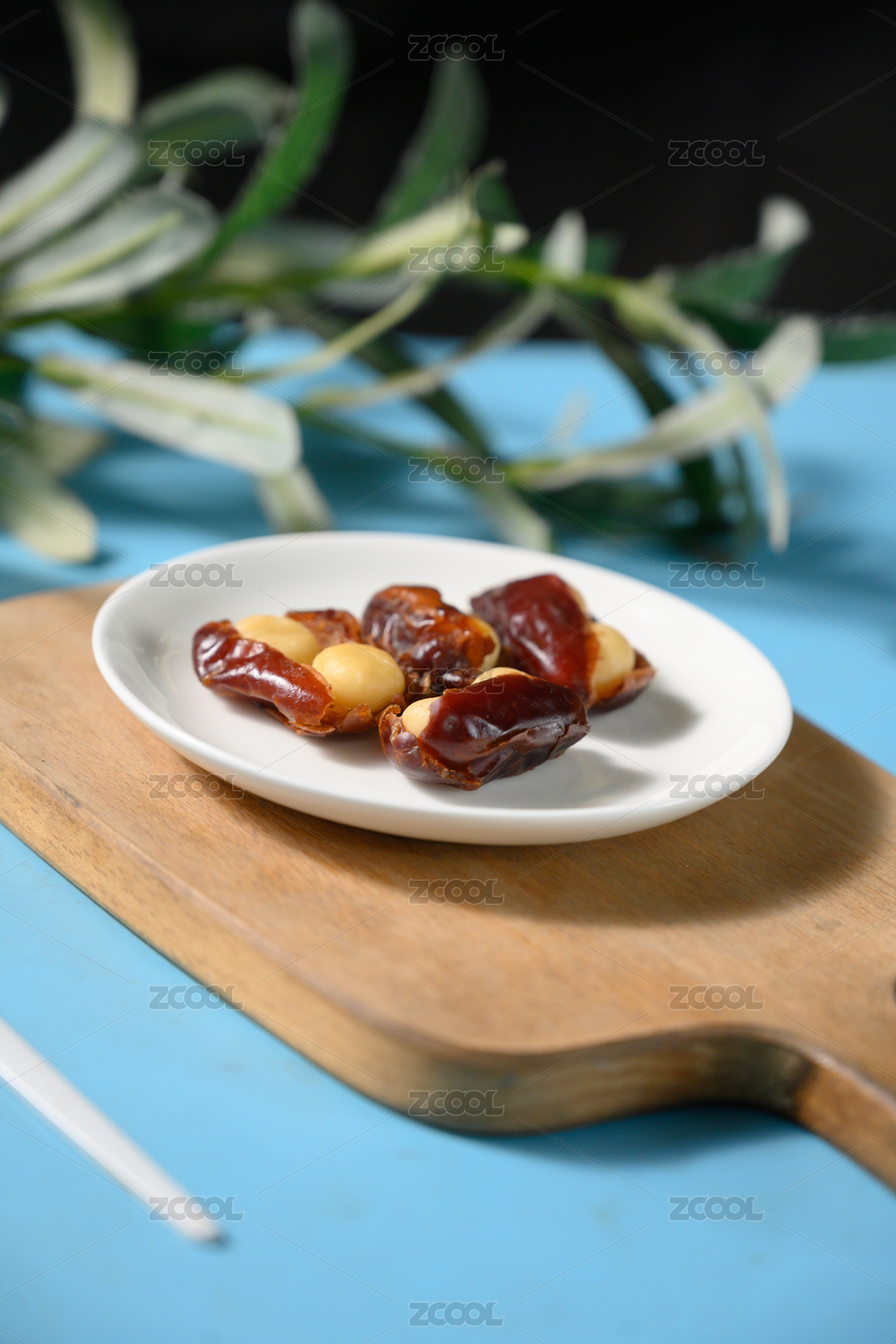 桌面上的盘子里的美味可口的椰枣夏威夷果仁